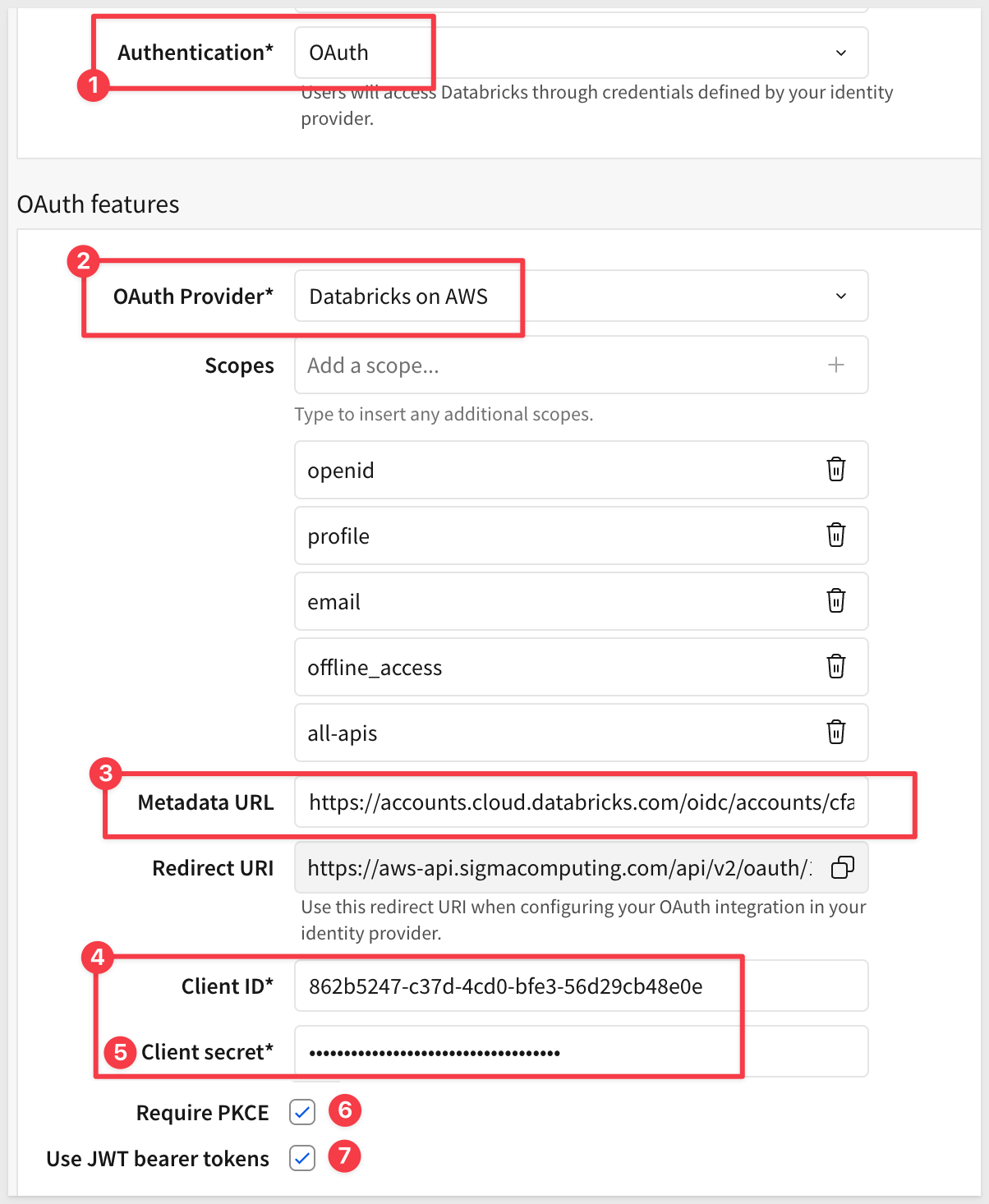 All APIs (required for Sigma OAuth authentication flow - includes SQL access)Client secret: