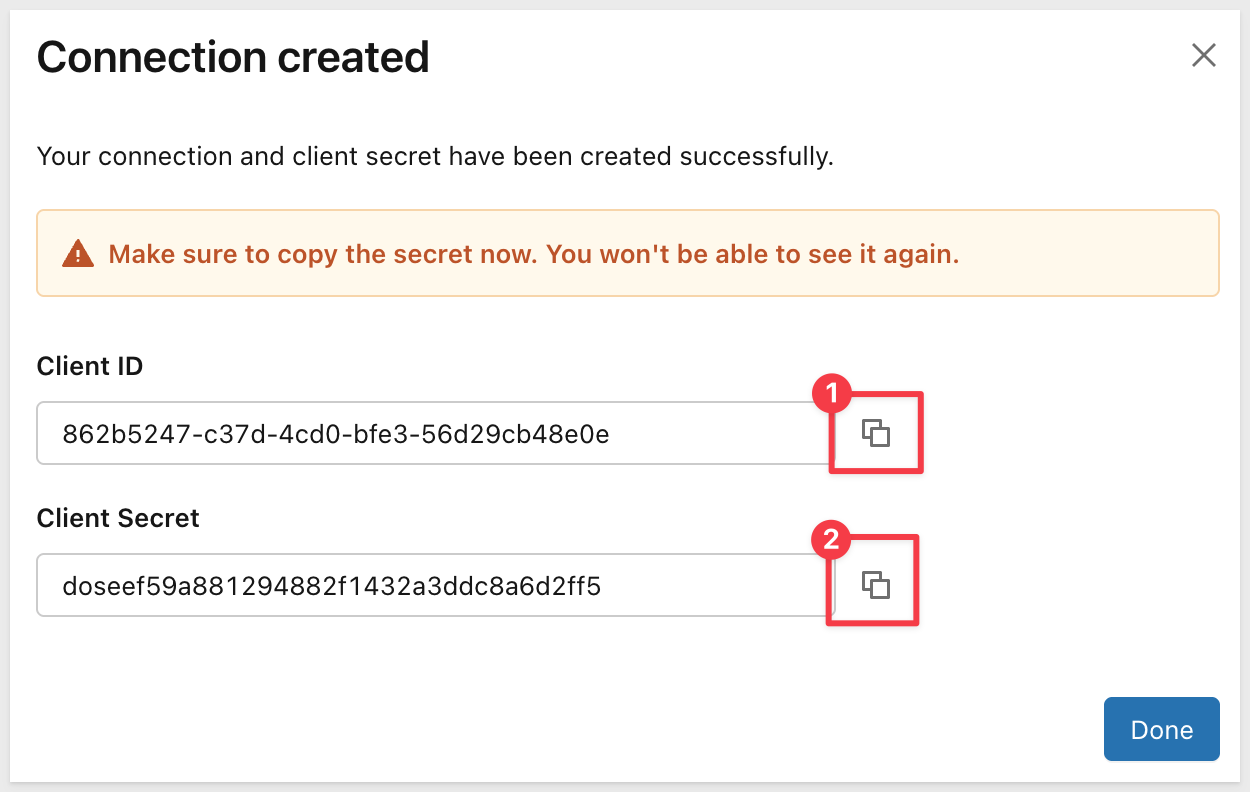 After creating the connection, Databricks displays the Client ID and Client Secret: