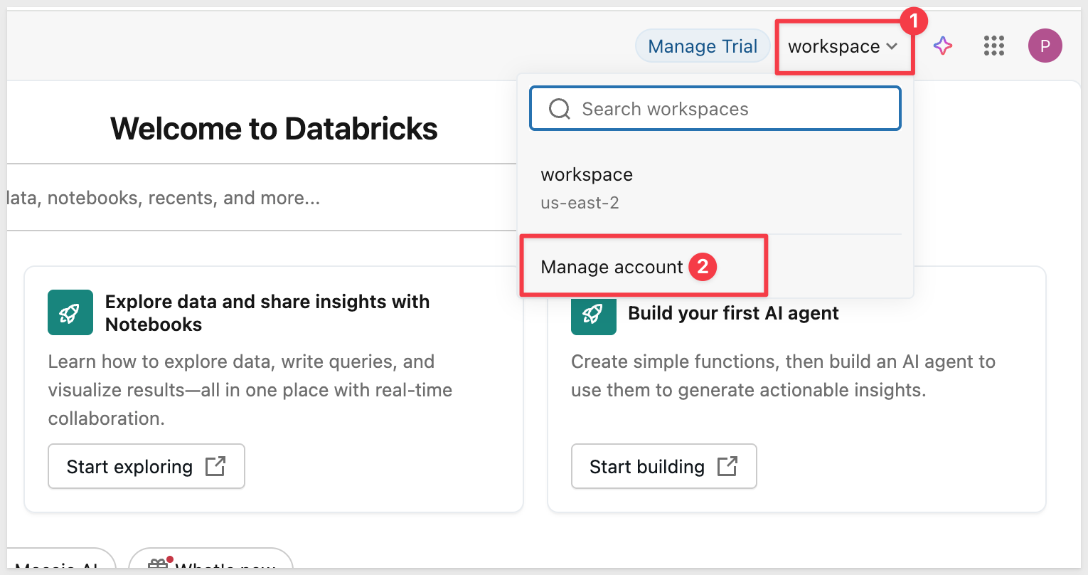 Select workspace and Manage account: