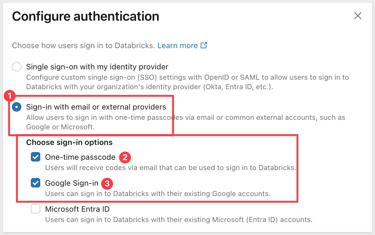 Under Choose sign-in options, make sure "One-time passcode" is checked. If you're using a Google email for your Databricks trial account, also check the Google authentication option: