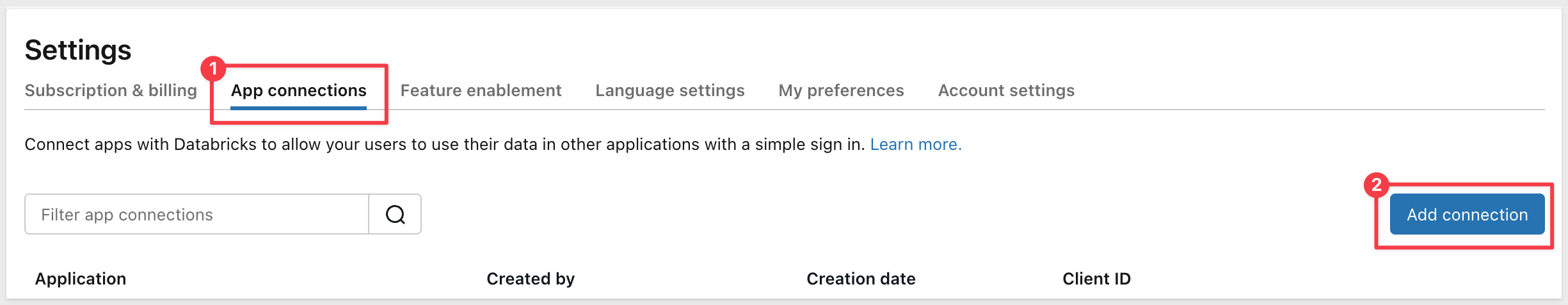 To enable OAuth authentication between Sigma and Databricks, you'll create an app connection in the Databricks Account Console.