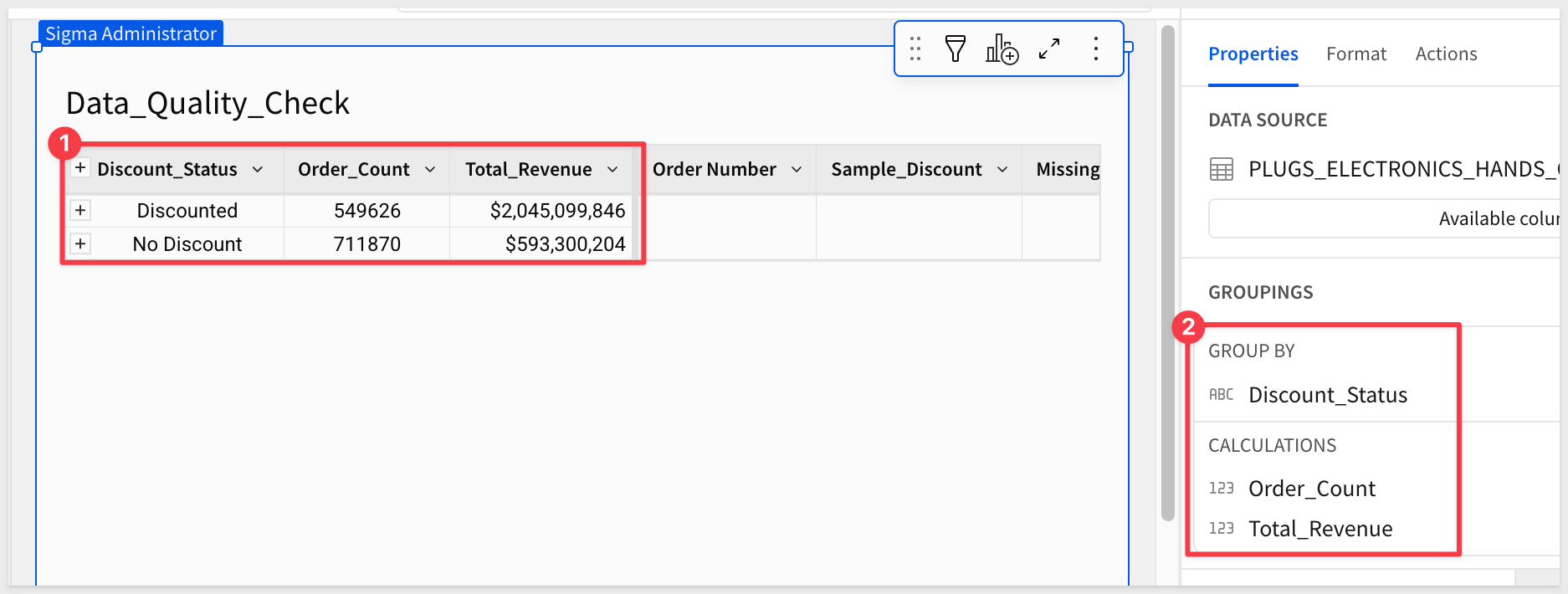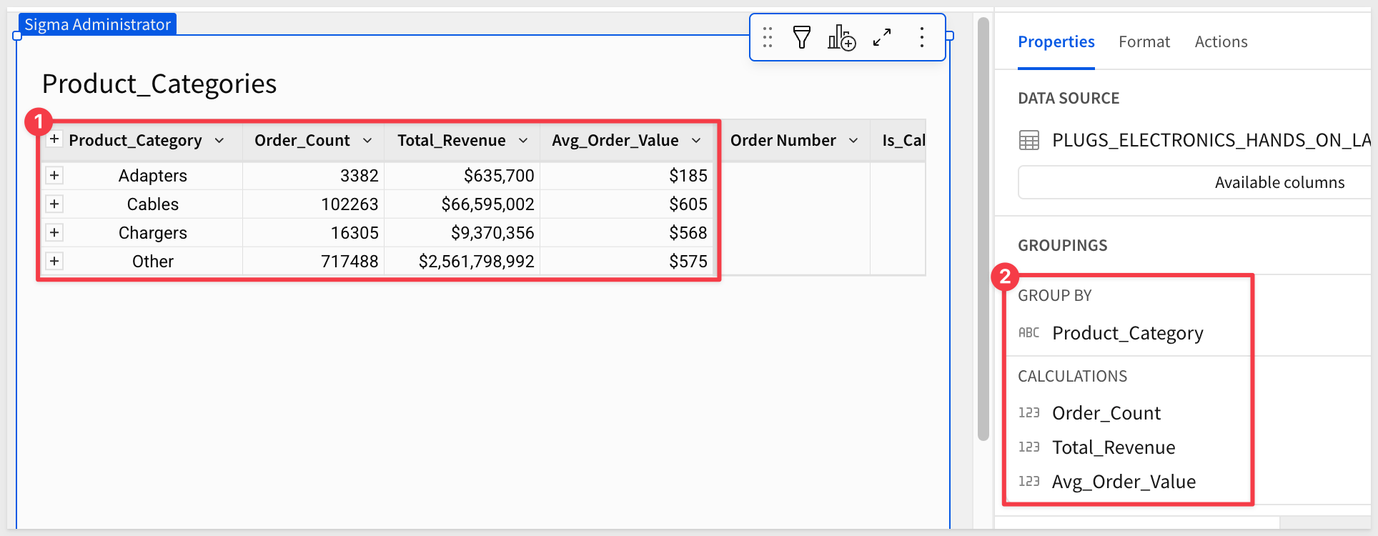 To make that visible in the table, we can group by Product_Category and add calculations to see sales by category.
