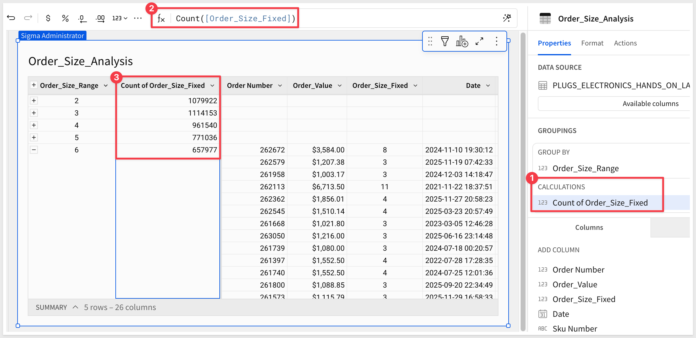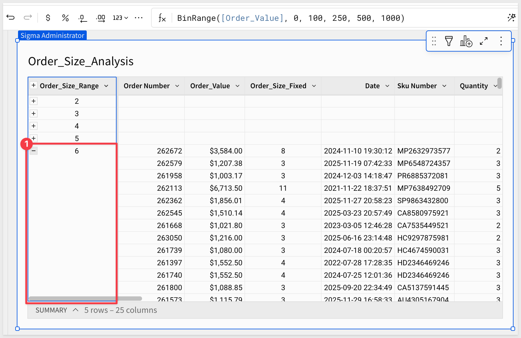 Now let's see the distribution. Group by Order_Size_Range and add a count: