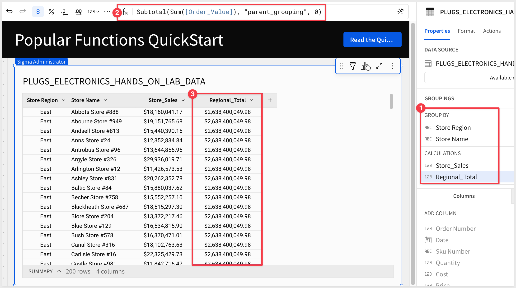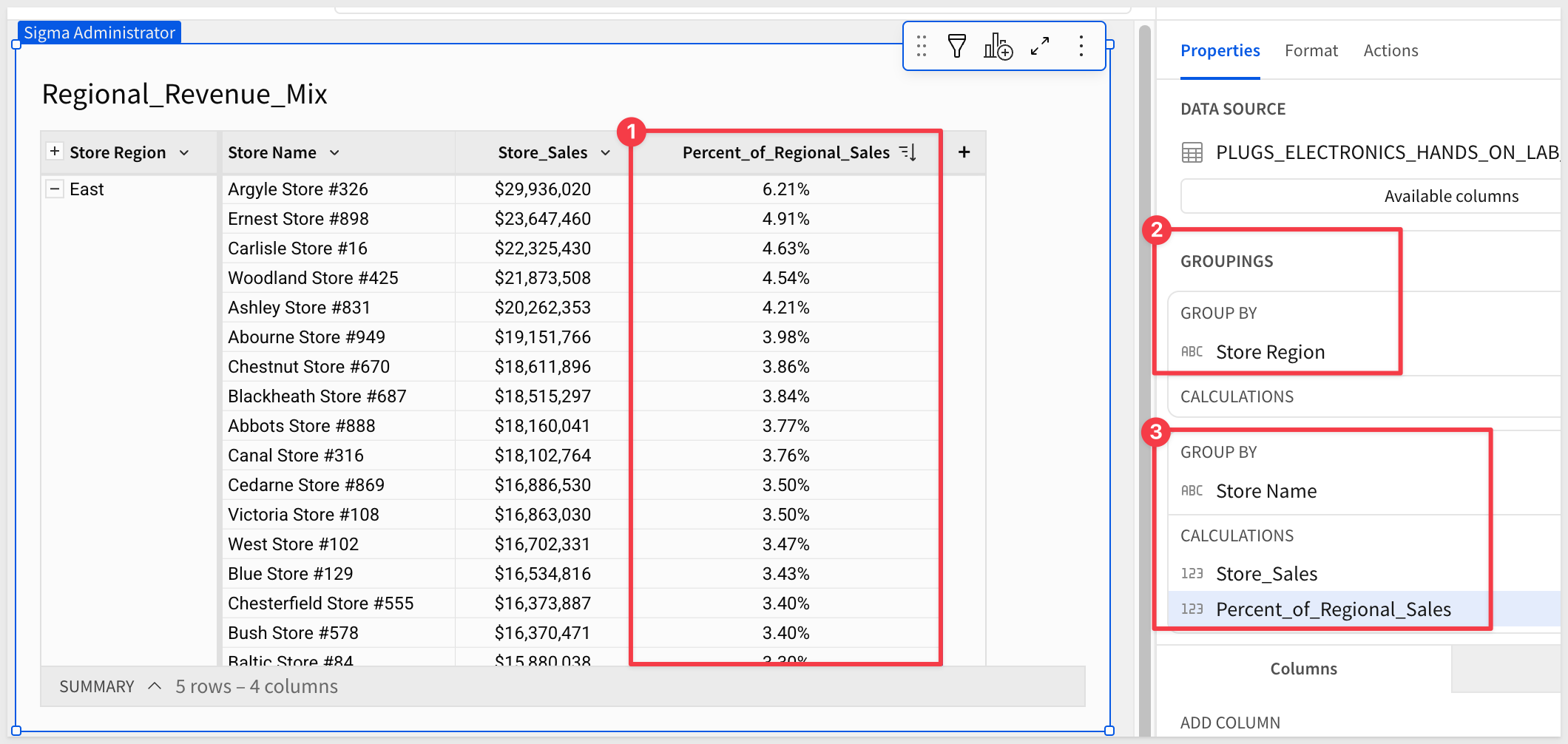 Notice that each store in the East region shows the same Regional_Total value (for example, $2,638,400,049.98). This is expected behavior - it's showing the total for all East region stores combined. Each store row displays its own Store_Sales alongside the complete regional total, enabling easy comparison.