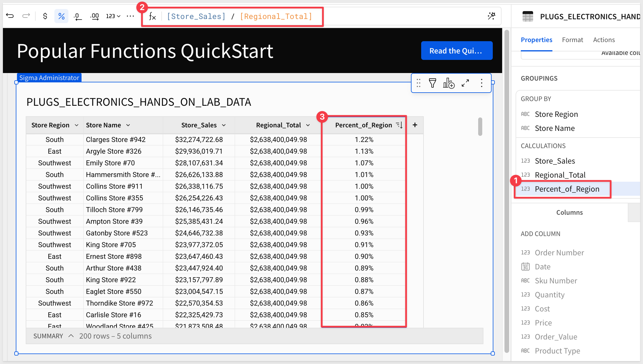 The PercentOfTotal function automatically calculates each store's percentage within its region. Because of the grouping hierarchy, it calculates percentages at the Store Name level relative to the Store Region total.