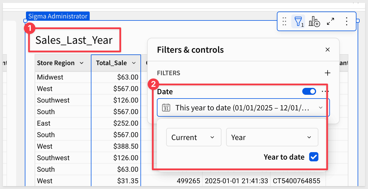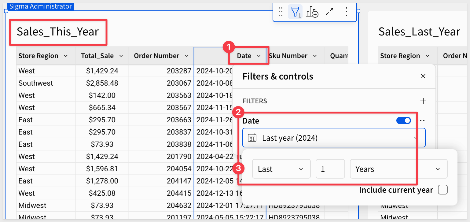 On the Sales_Last_Year table, add the same Total_Sale column and filter to show only last year's data.