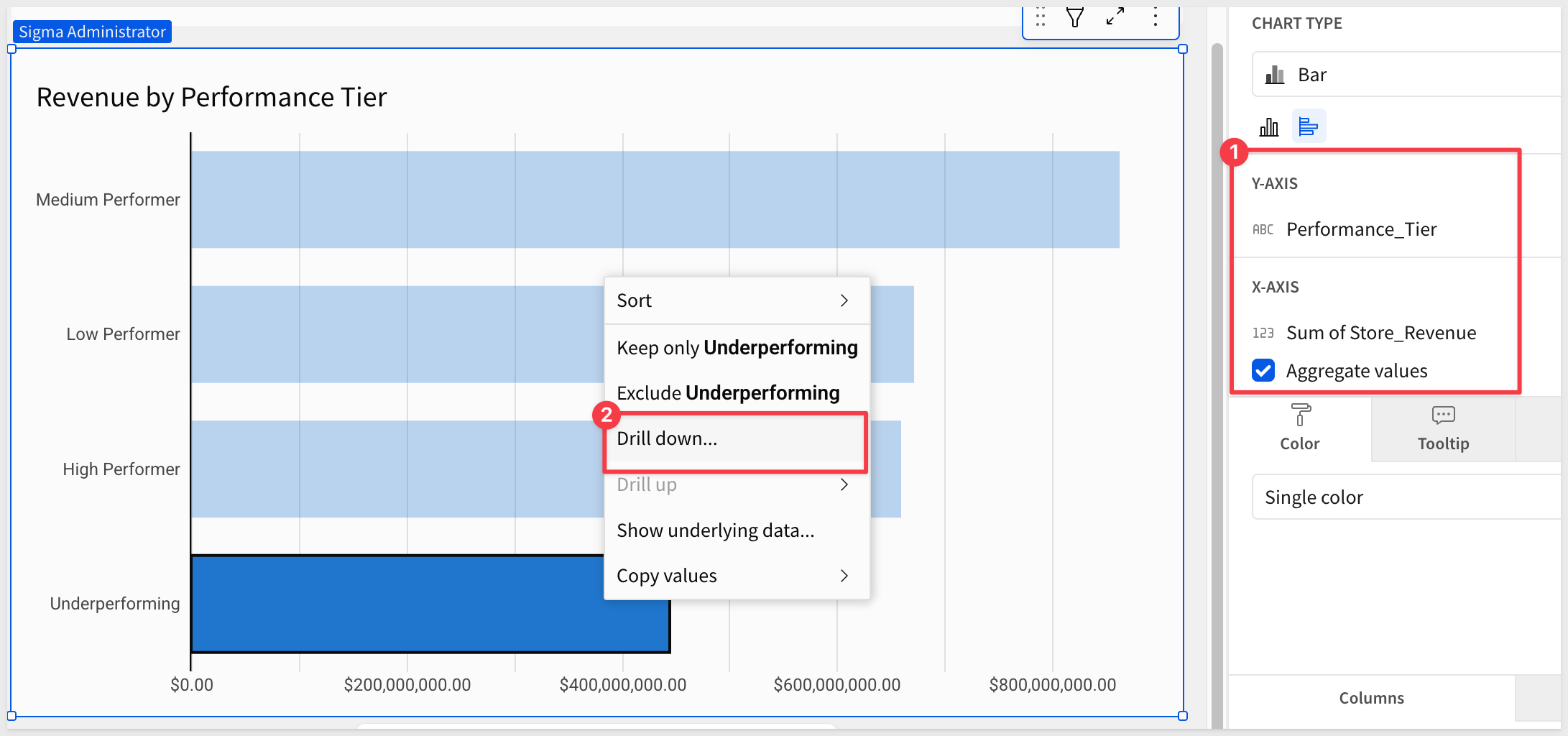 Now we can easily see the underperforming stores; right-click and Drill down to explore the underlying data: