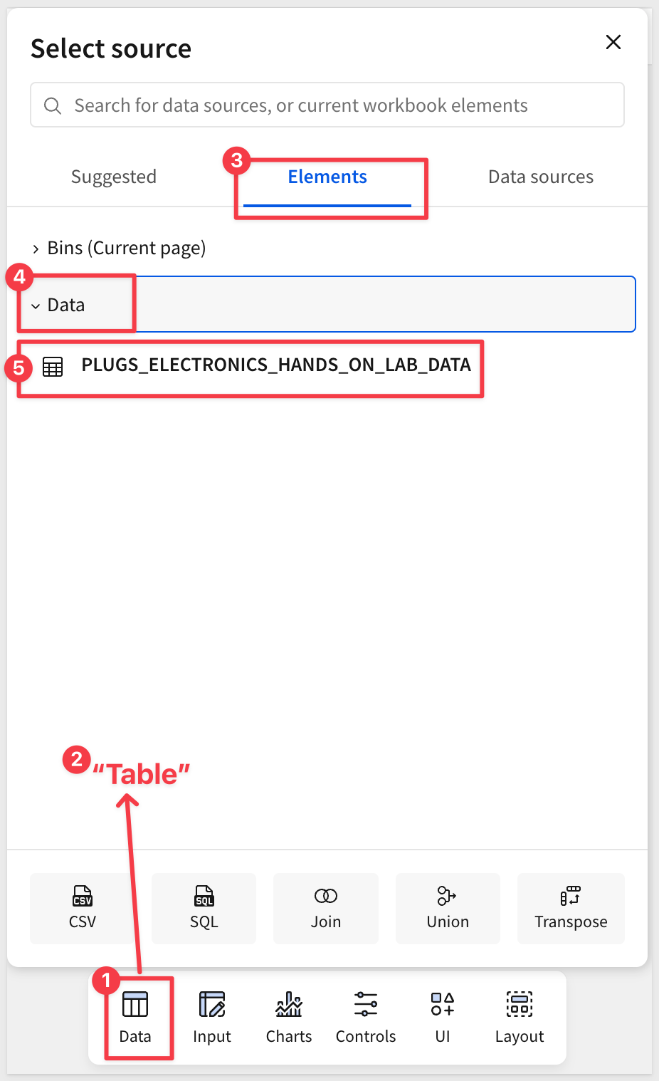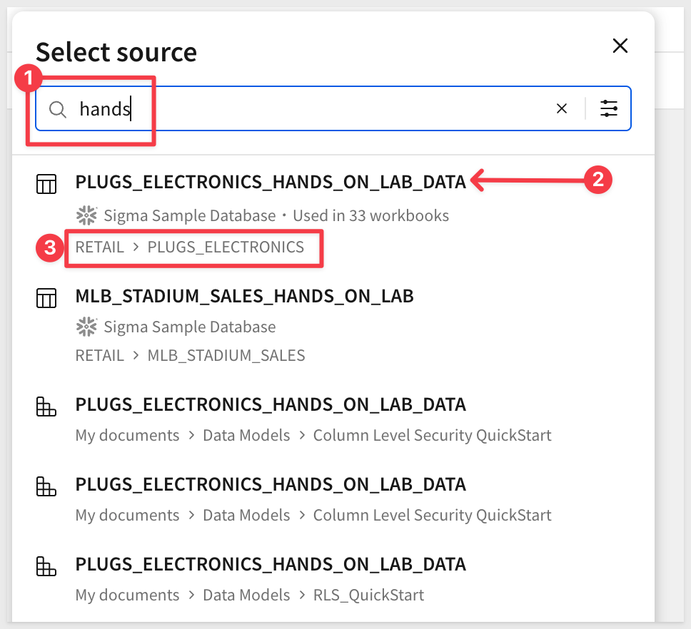 In the Select source modal, search for Hands and select the PLUGS_ELECTRONICS_HANDS_ON_LAB_DATA table from the RETAIL database: