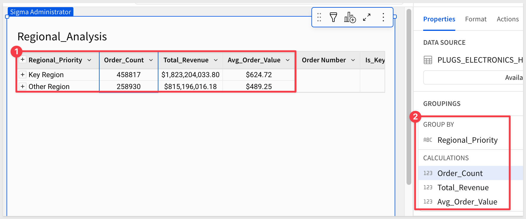 In the Regional_Analysis table, click the Grouping icon and add two levels: