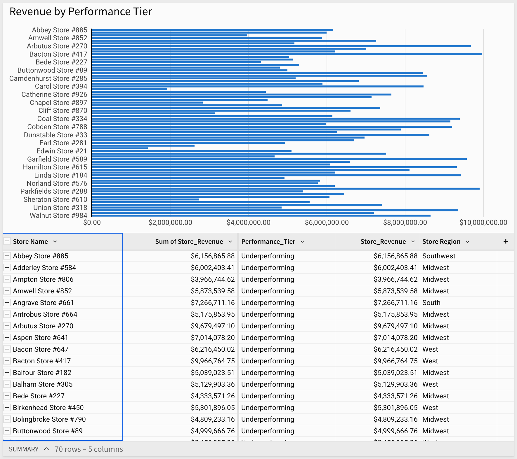Business Insight: The bar chart reveals your store portfolio's performance distribution at a glance. You can quickly see the total revenue contribution from each tier and identify how many stores fall into each category. This segmentation enables targeted strategies - high performers can be studied for best practices, medium performers can be pushed toward high performance, and underperformers require intervention or evaluation.