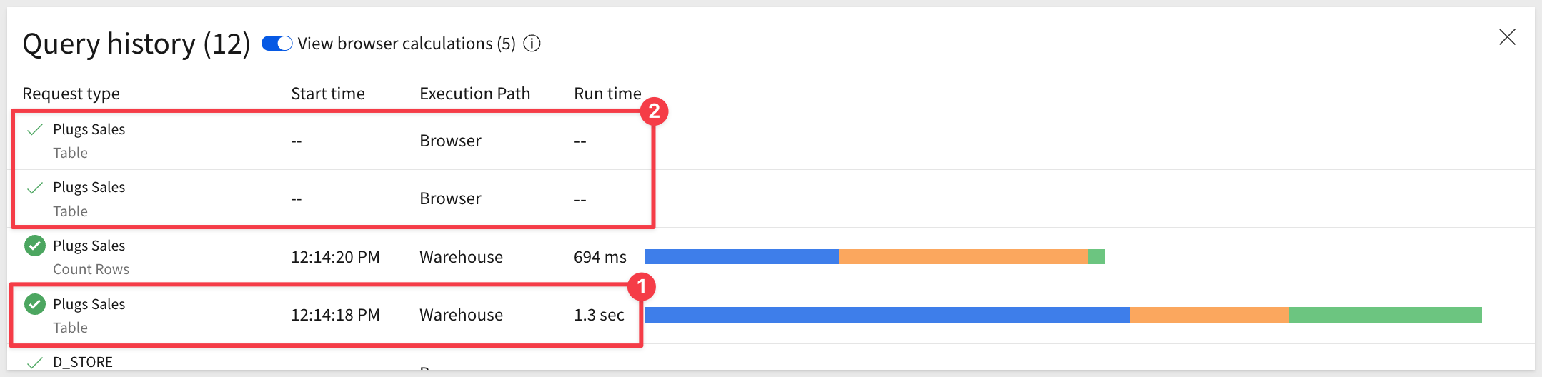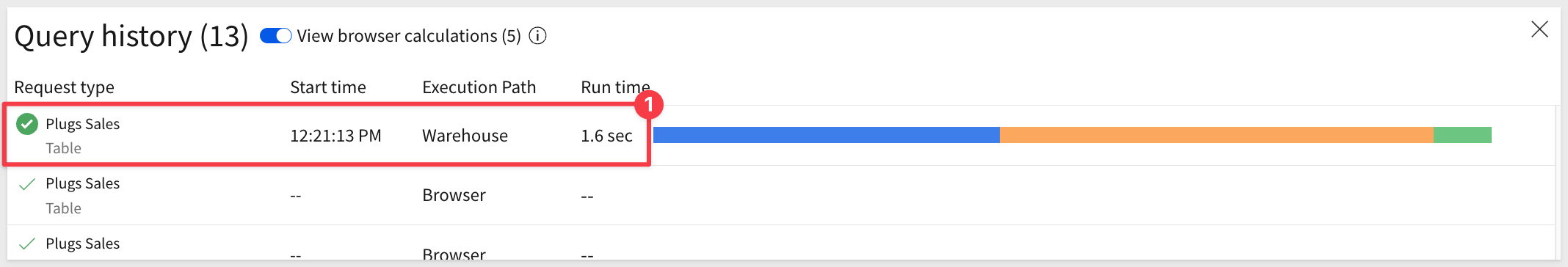 In our case, the page was just loaded so there are only two entries on the list. The second one is the table data being fetched from the warehouse cache. It came from the cache because we had accessed it recently, so it was still stored.