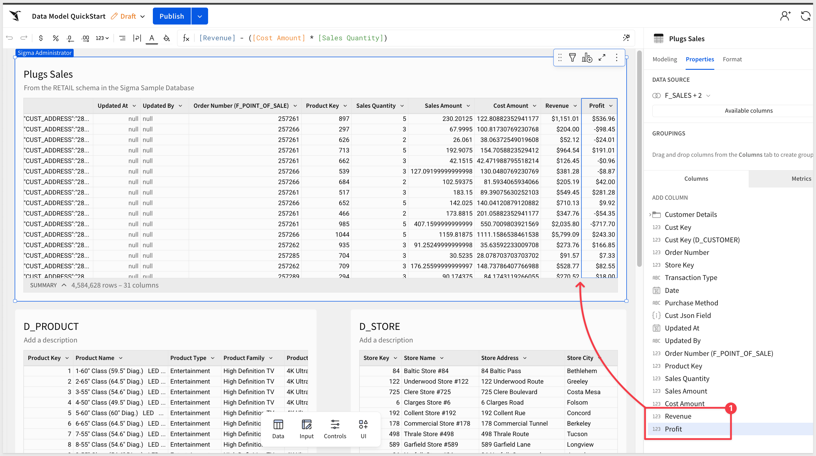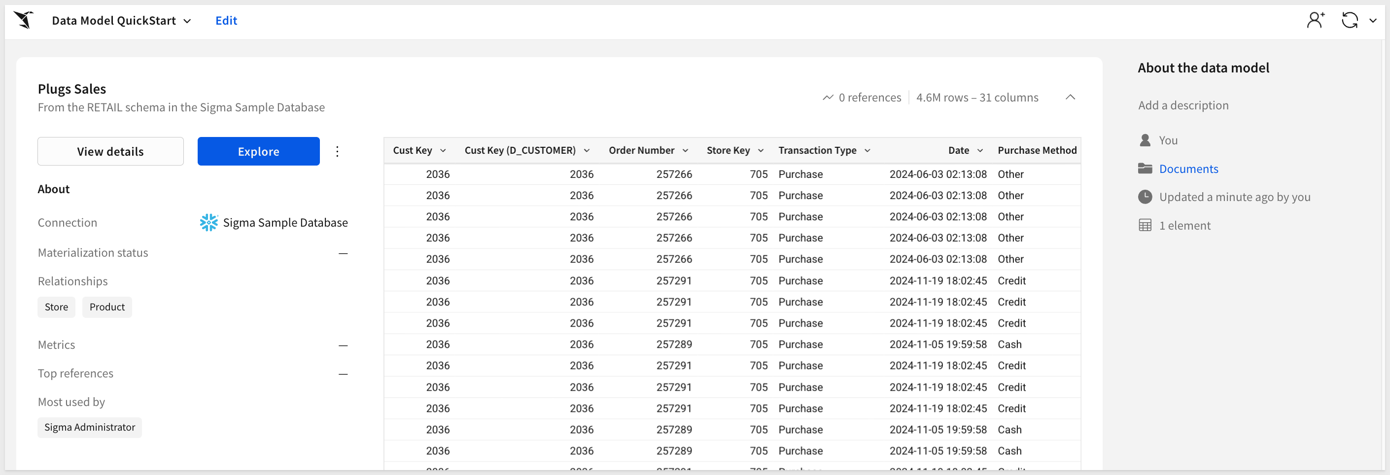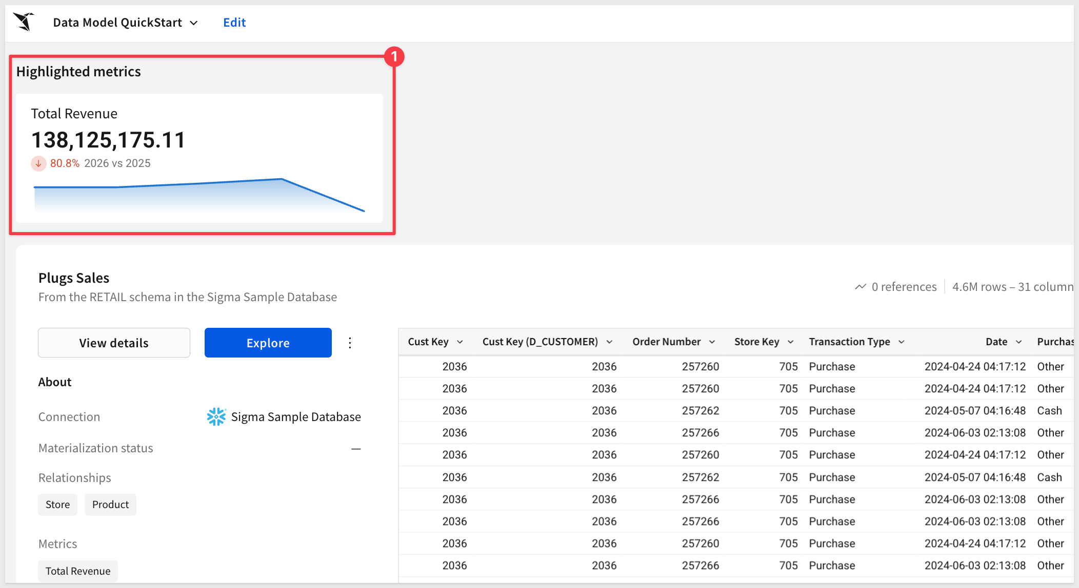 Return to the Data Model QuickStart, place it in Edit mode and select the Plugs Sales table.