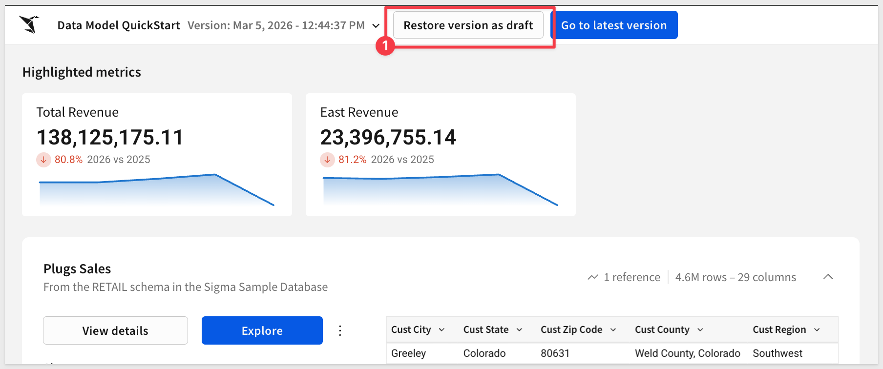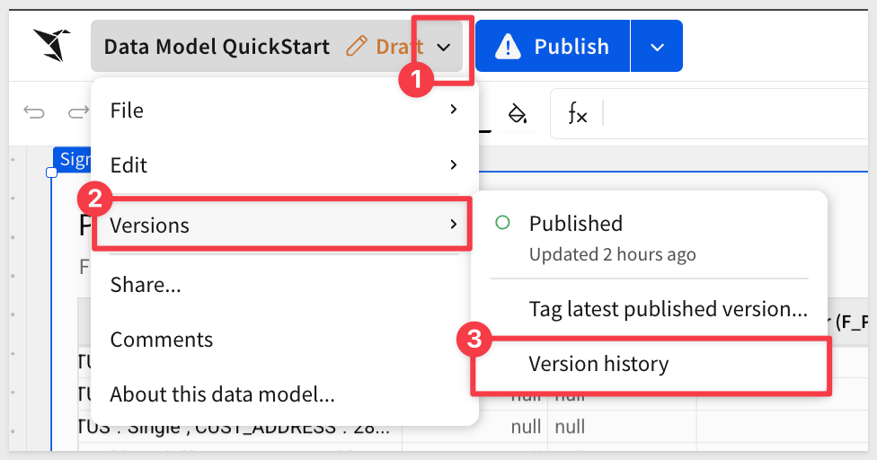 If we click on the text Move columns, the data model reverts and gives us the option to Restore version as draft: