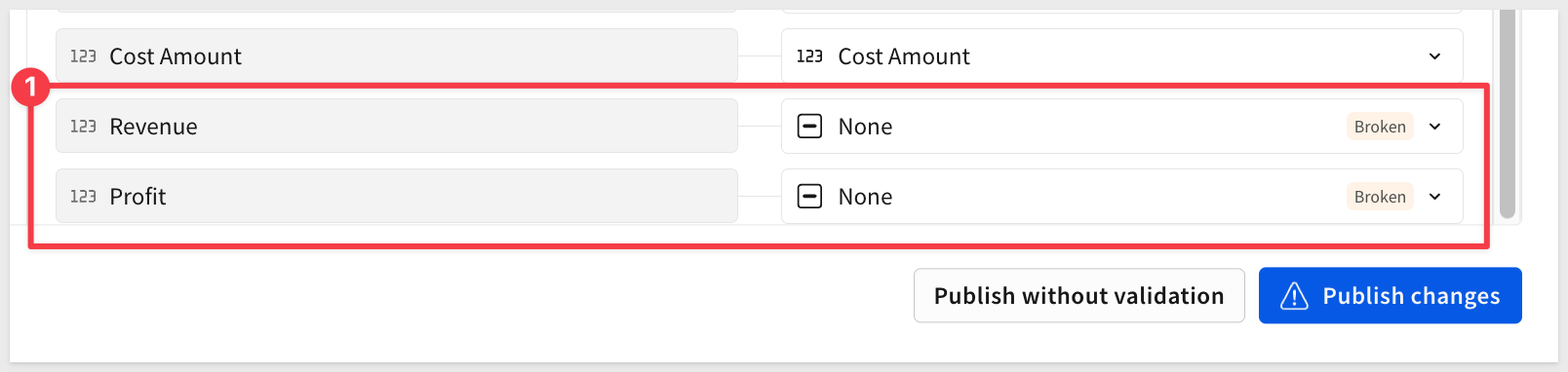 We have the option to Publish without validation but let's not do that as we have broken columns.