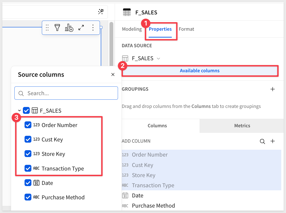 If we view the data model in the Published version and Explore it, we see that the restricted columns do not appear in the column list and are not available via Source columns: