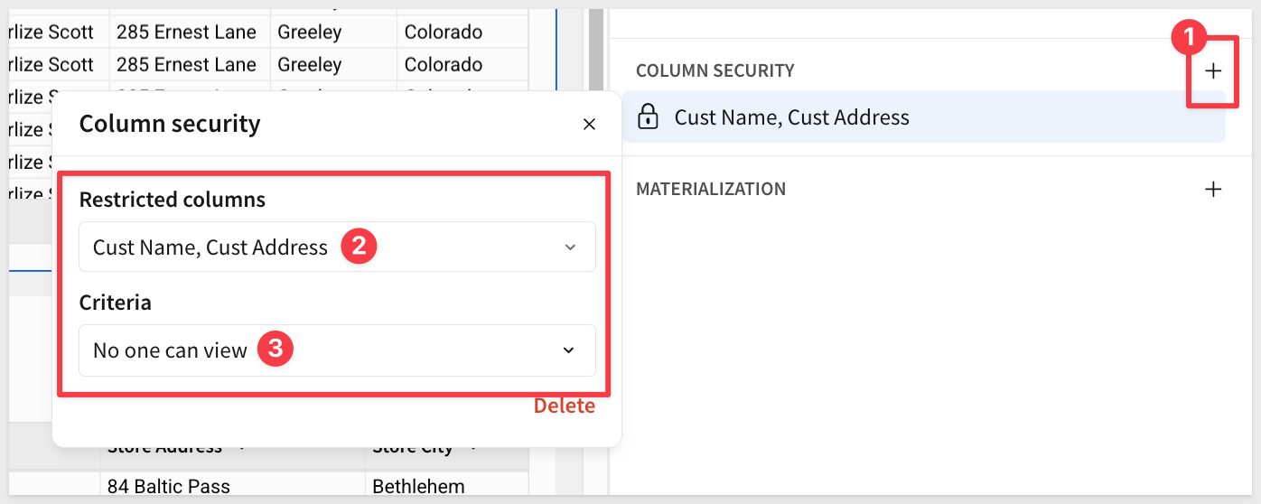 Cust Name and Cust Address columns are present in our table. This is against the use case policy described earlier and we'll need to fix it. Hiding the columns is not sufficient and we will correct this shortly: