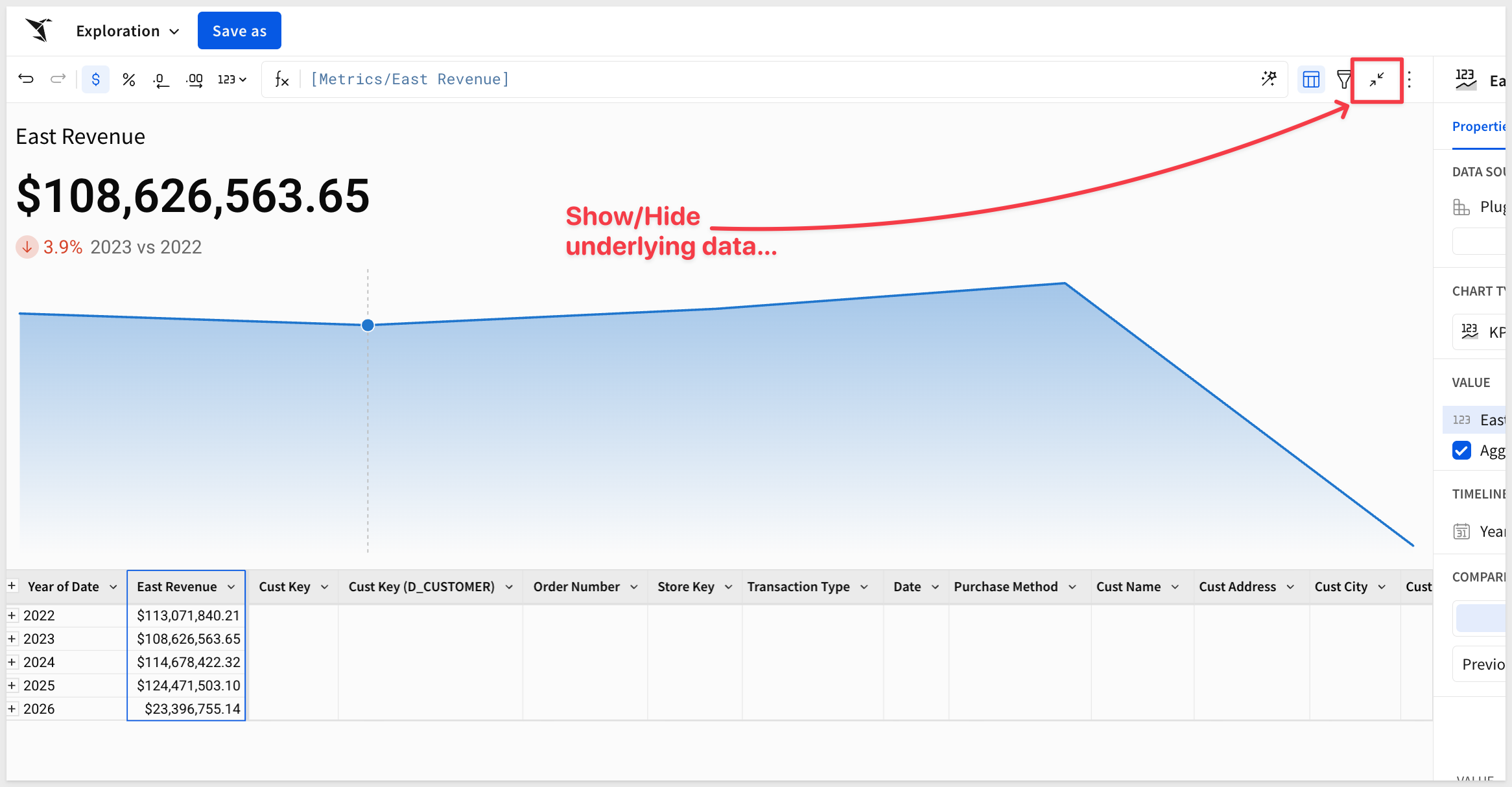 We can now group by Cust Region and use the Total Revenue metric that is supplied for us as a CALCULATION: