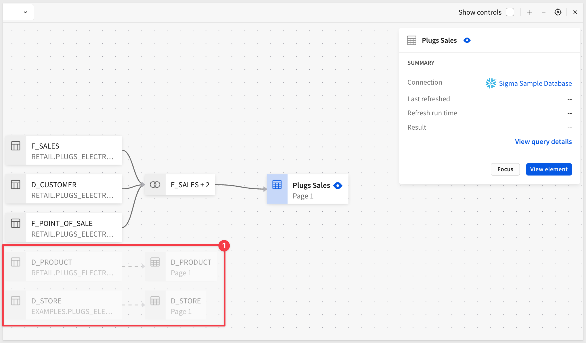 To satisfy marketing's request we will use five tables that are provided to all Sigma customers in the Sigma Sample Database > PLUGS_ELECTRONICS schema.