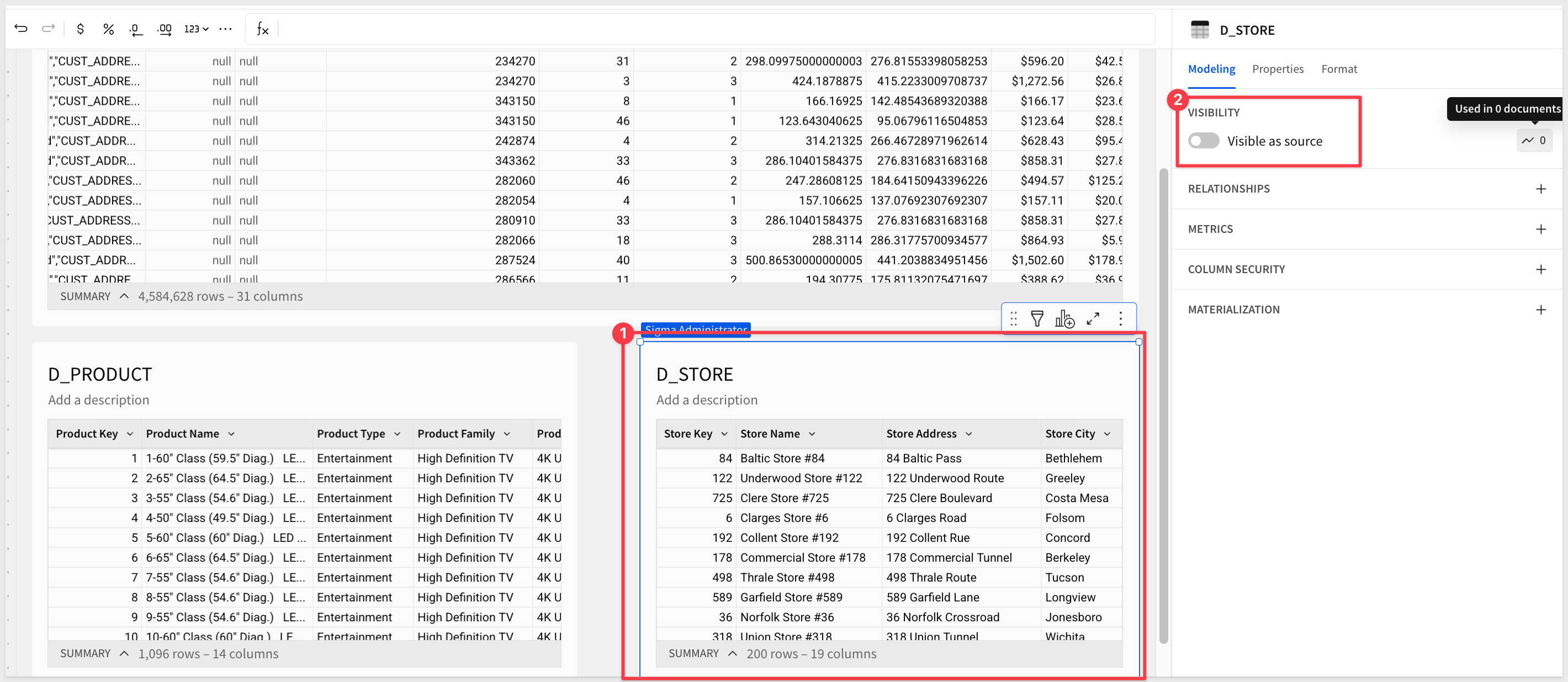 F_SALES remains a clean fact table, reusable elsewhere.Before we can create a relationship, we need to add the two tables we want to expose to the builder.