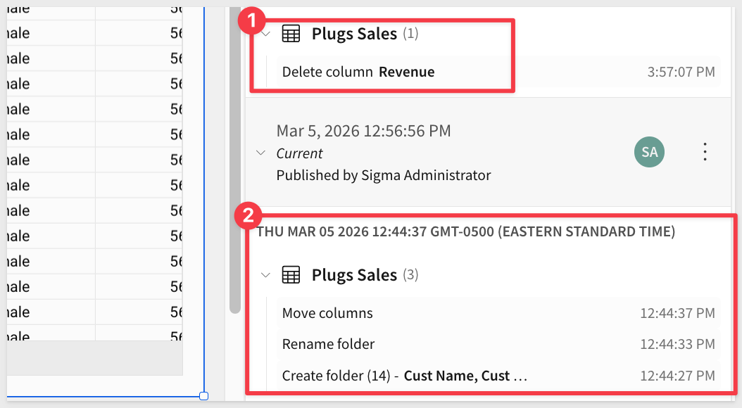 When you delete elements, columns, metrics, or relationships that are referenced in downstream documents, Sigma detects the impact and provides a workflow to map replacements before publishing.