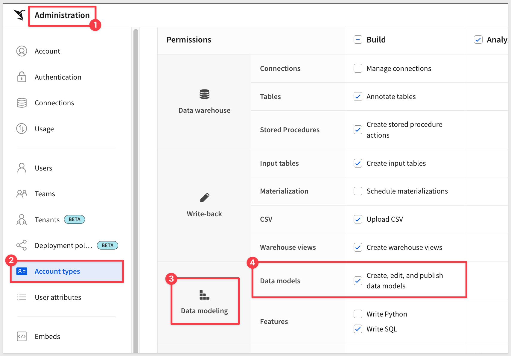 By default, Sigma account types provide the following data modeling permissions: