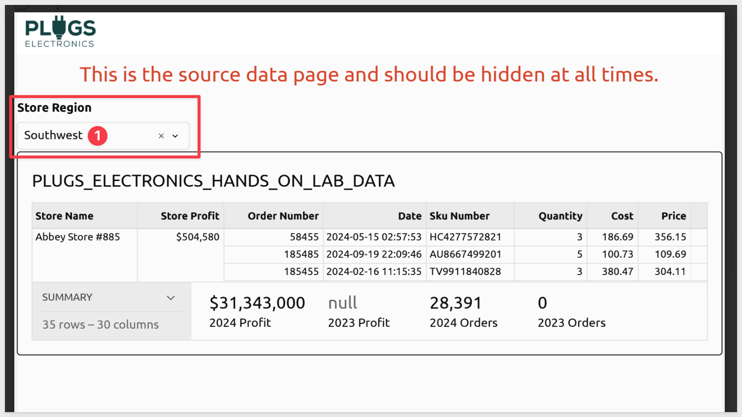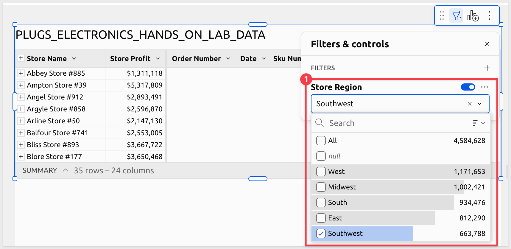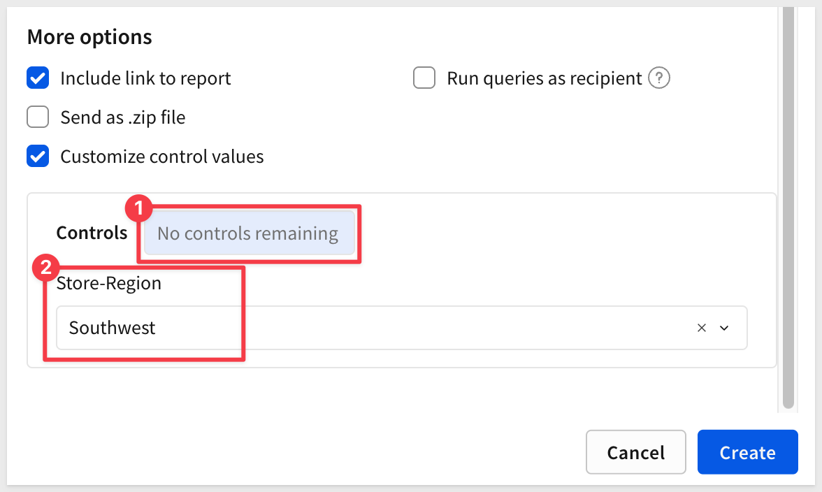 In the control box, select Store-Region and target the Southwest region. This forces the report to filter the data appropriately for the intended recipient.