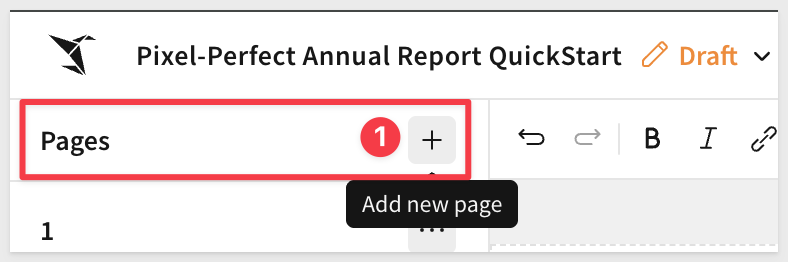 The layout for the page is very similar to a workbook with an element bar, element panel on the left. What is different is the left sidebar which allows us to navigate the pages of our report. Since this is new, there is one blank page to start.