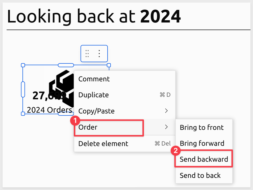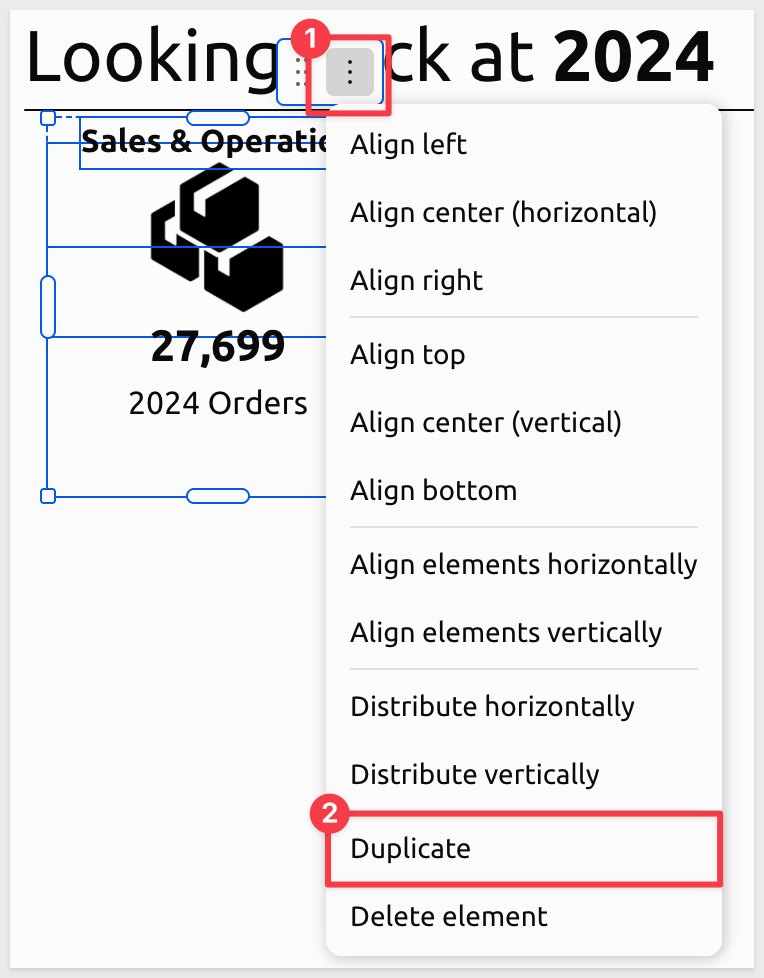It can be faster to Duplicate existing elements and adjust their configuration than to create from scratch. Using the left mouse button, drag a box around the three elements that make up the KPI and select Duplicate: