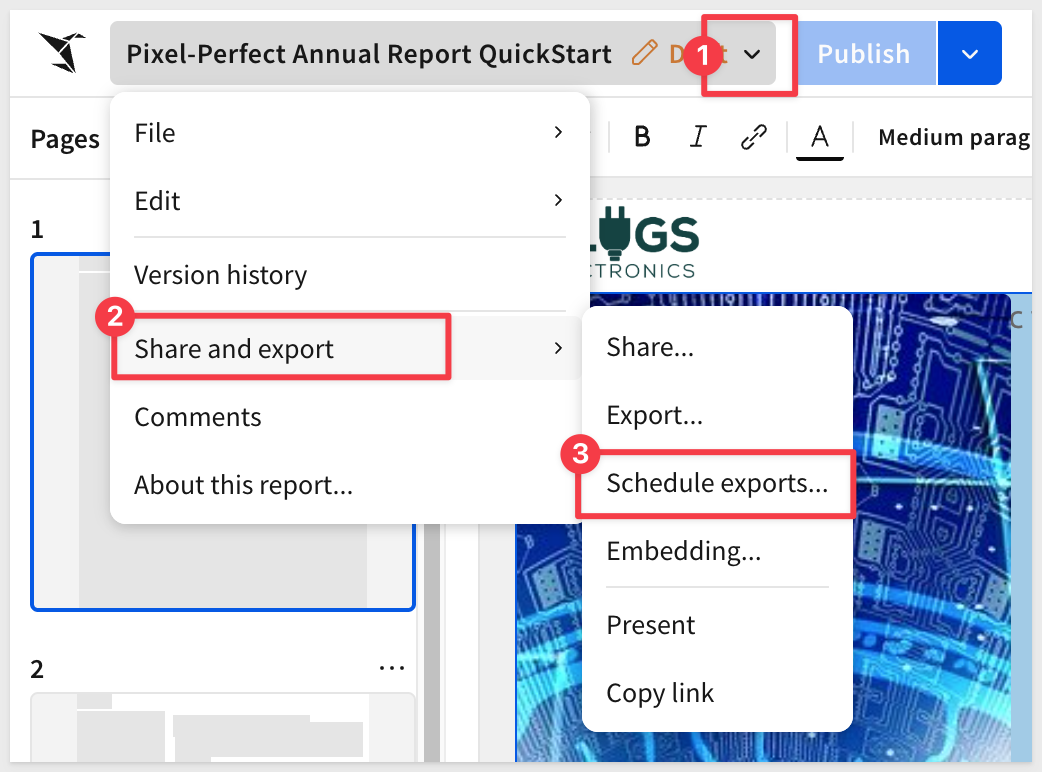Select Share and export > Schedule exports from the report name menu:
