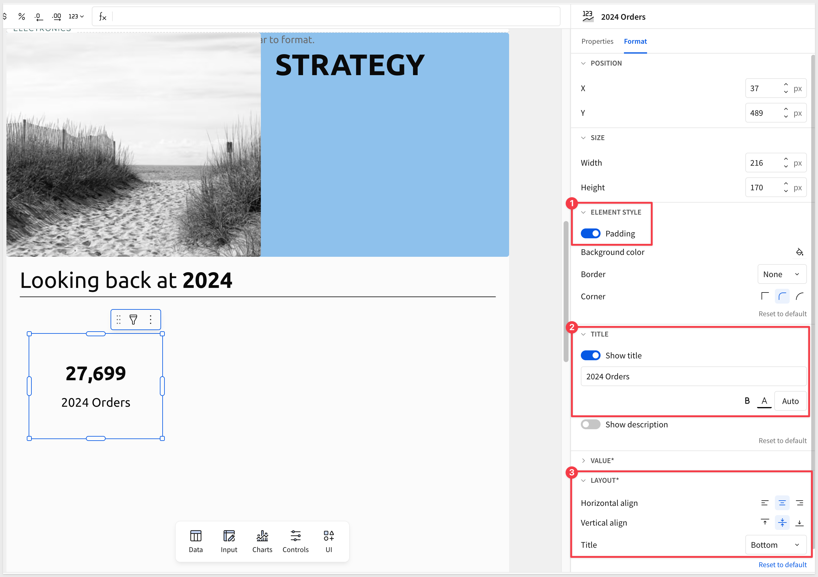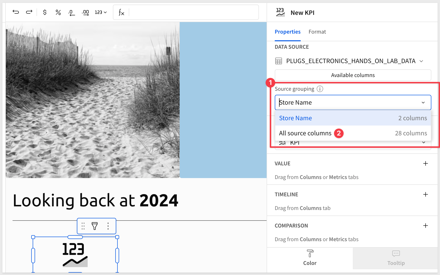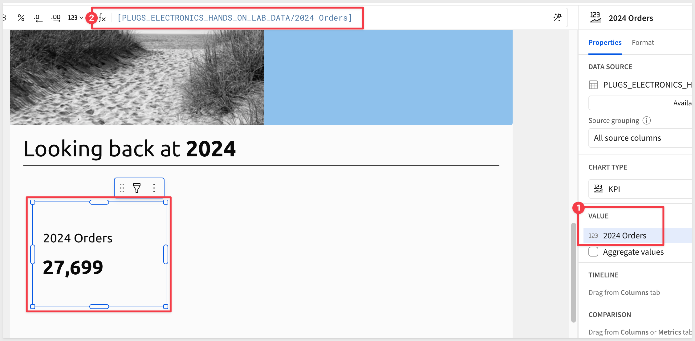 Now that we have access to all the table columns, configure the first KPI like this, using the 2024 Orders summary column: