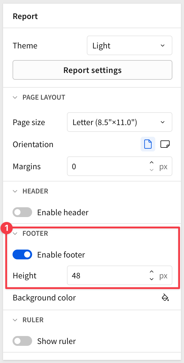 We want our report to have the page count in the footer, so enable the Footer: