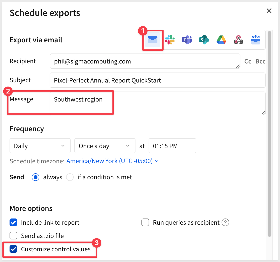 For more information on basic export scheduling, see Send or schedule export