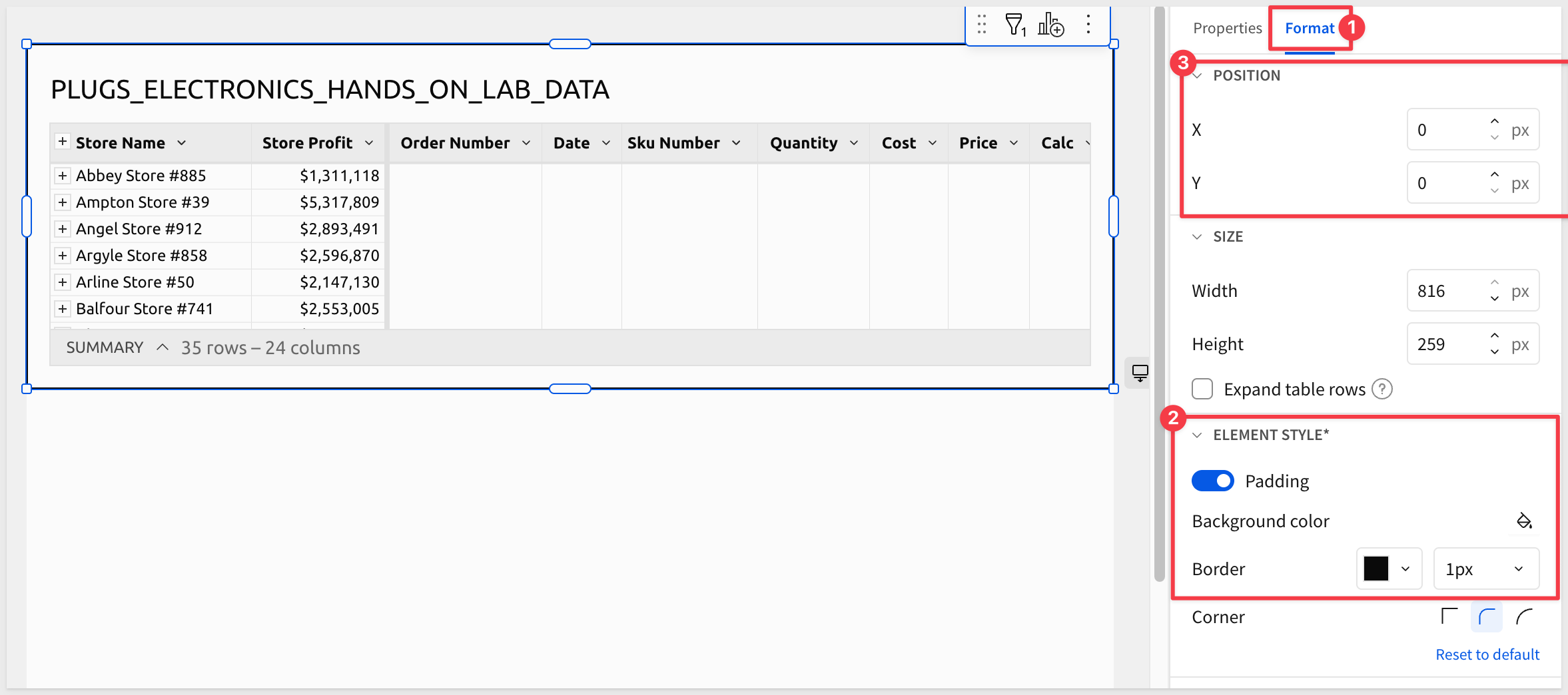 While doing this, we see a new section that allows us to control the POSITION of the selected element (the table) by one pixel increments. This allows us to achieve the fine control required to produce our pixel-perfect report. Since this page is intended to be hidden, we don't need to configure that.