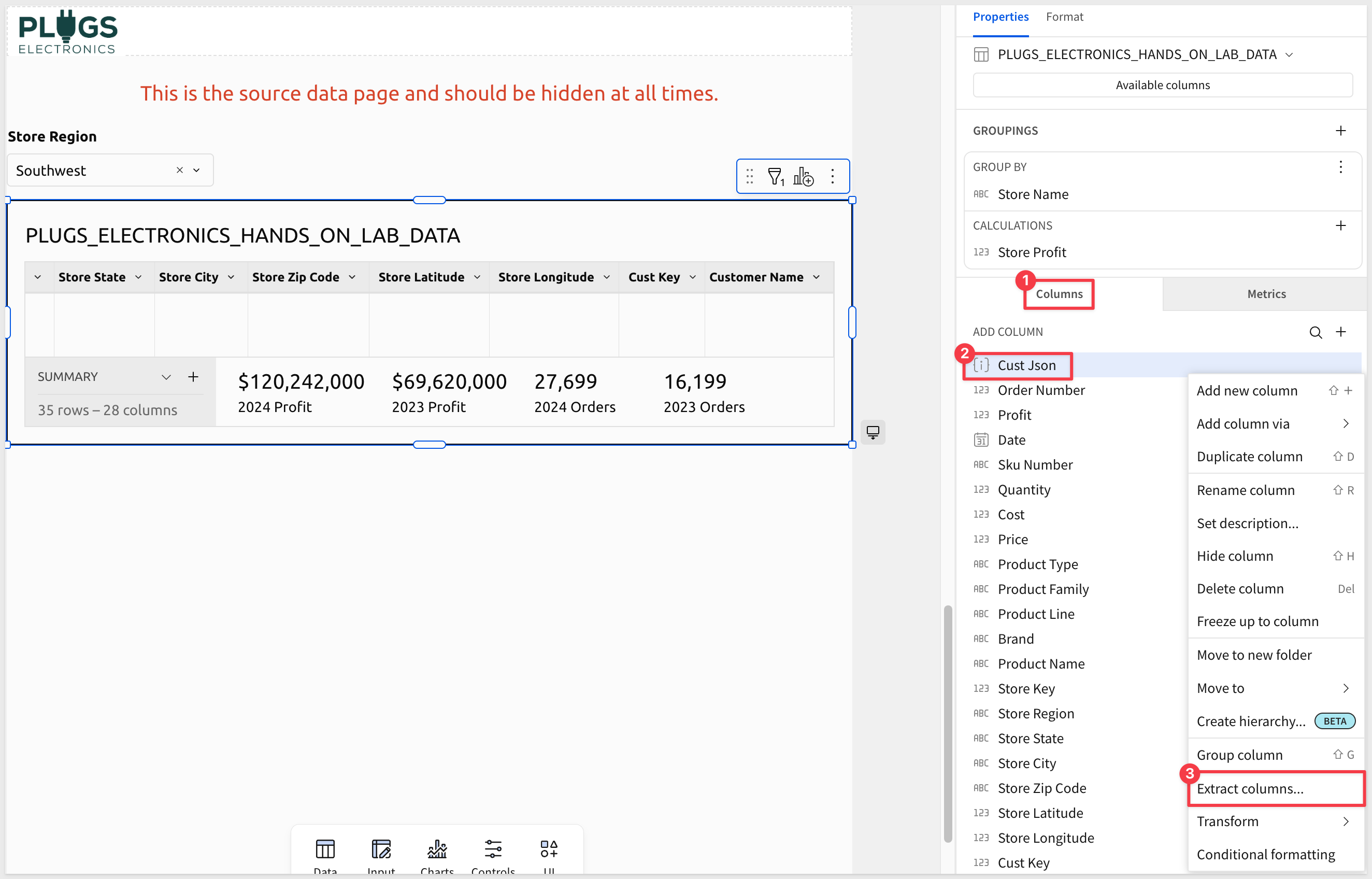 Return to the data page, locate the Cust Json column in the column list and select Extract columns from its menu: