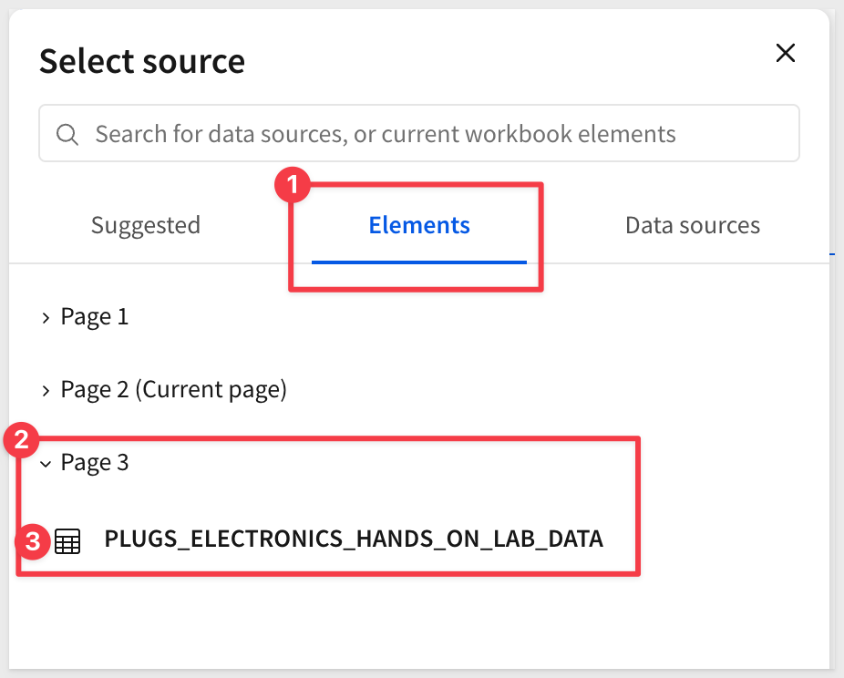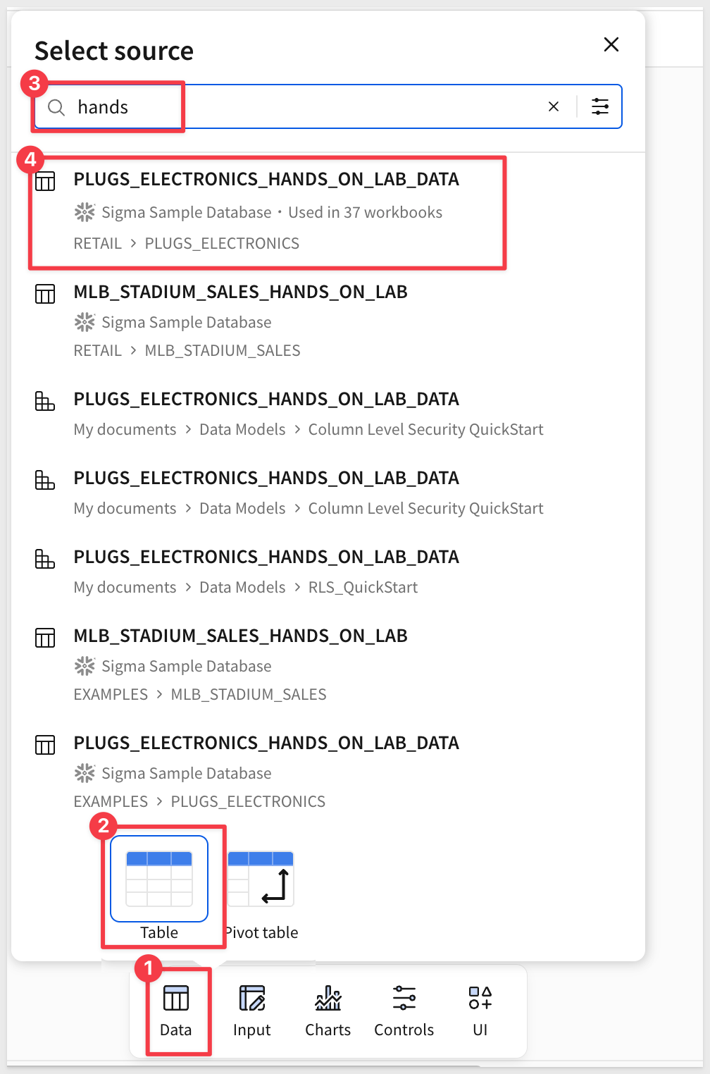 Using the Element bar select Data > Table search for Hands and select the PLUGS_ELECTRONICS_HANDS_ON_LAB_DATA table from the RETAIL > PLUGS_ELECTRONICS schema: