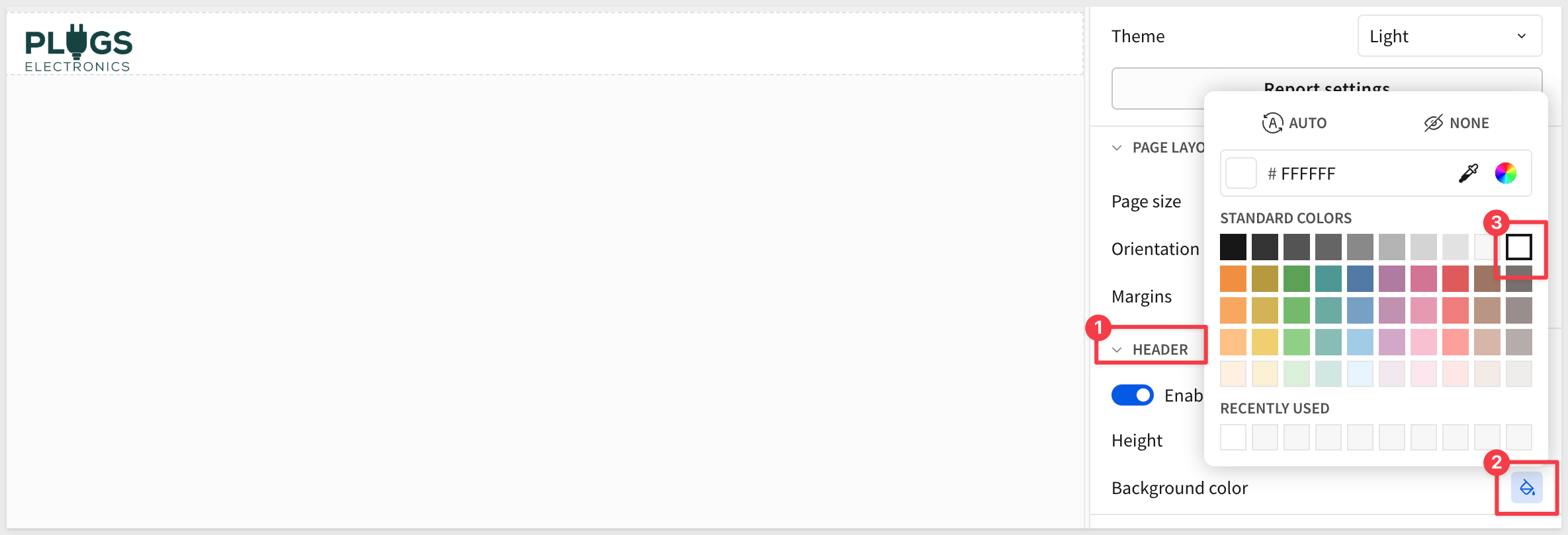 Enable the page header and place the Plugs logo in the upper left corner using an UI >Image element from the element bar.