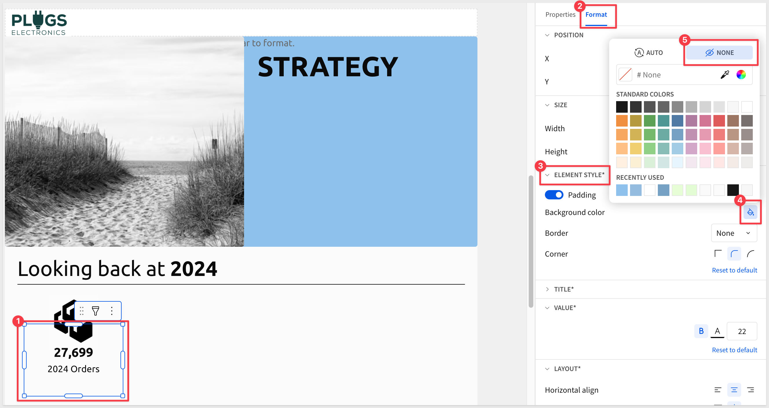 We can add more images but we can also use the Text element and change its background color to add styling too.