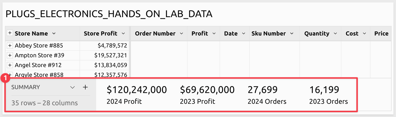 We also need some additional metrics from the table so that we can expose them in the report. We will use the table's SUMMARY feature for that.