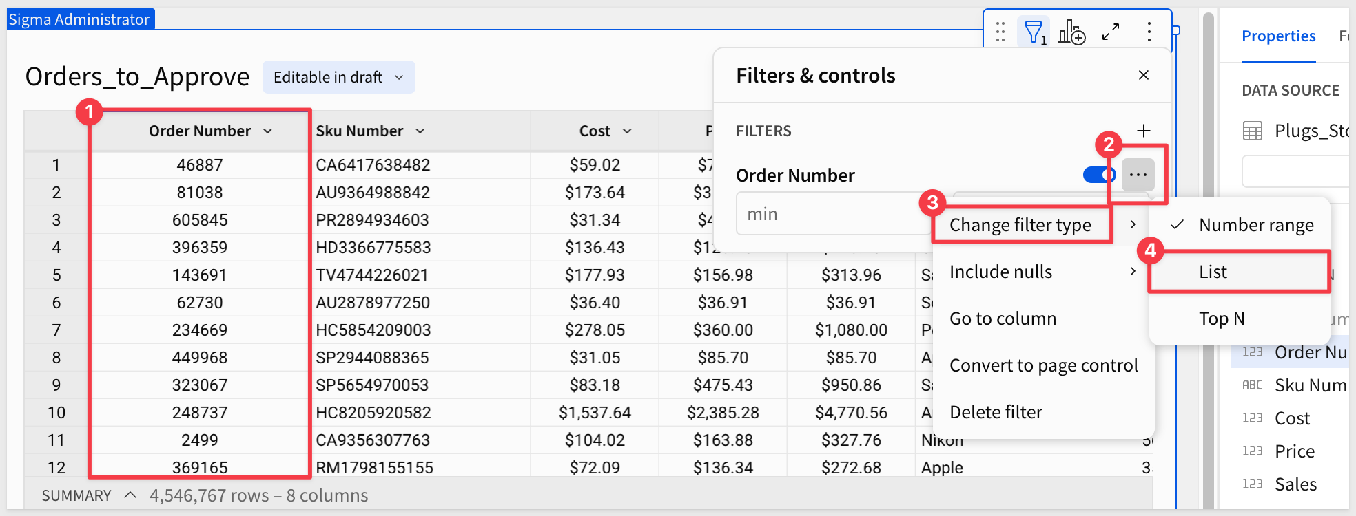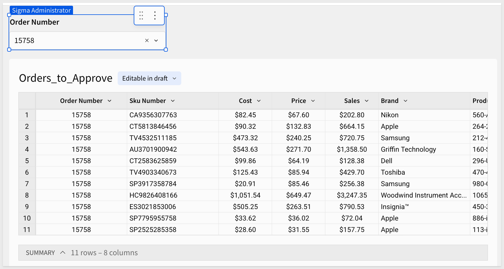 Selecting Order Number > 15758 filters the input table just like it would a standard table or pivot table. It also shows that one order can have many Sku Numbers: