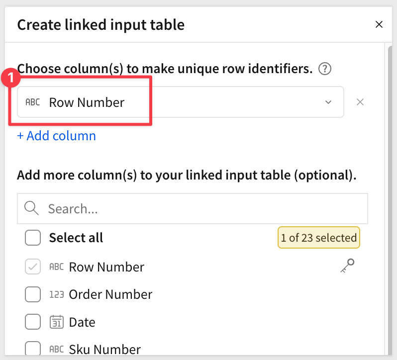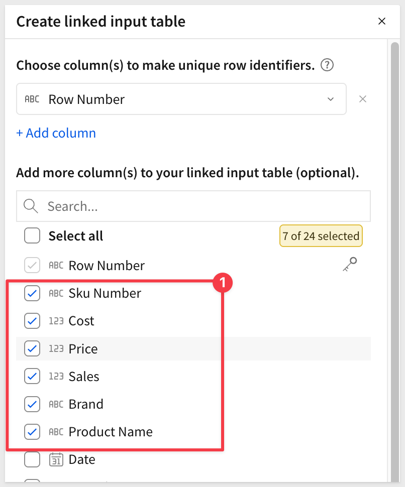 All input tables include two optional row history columns. Add these by clicking on the + icon and selecting Last updated at and Last updated by.