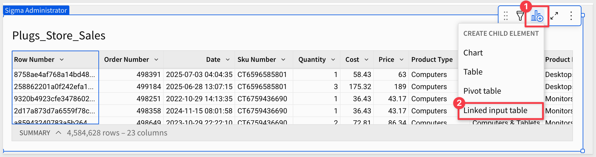 Create a Linked Input Table from the PLUGS_ELECTRONICS_HANDS_ON_LAB_DATA table.