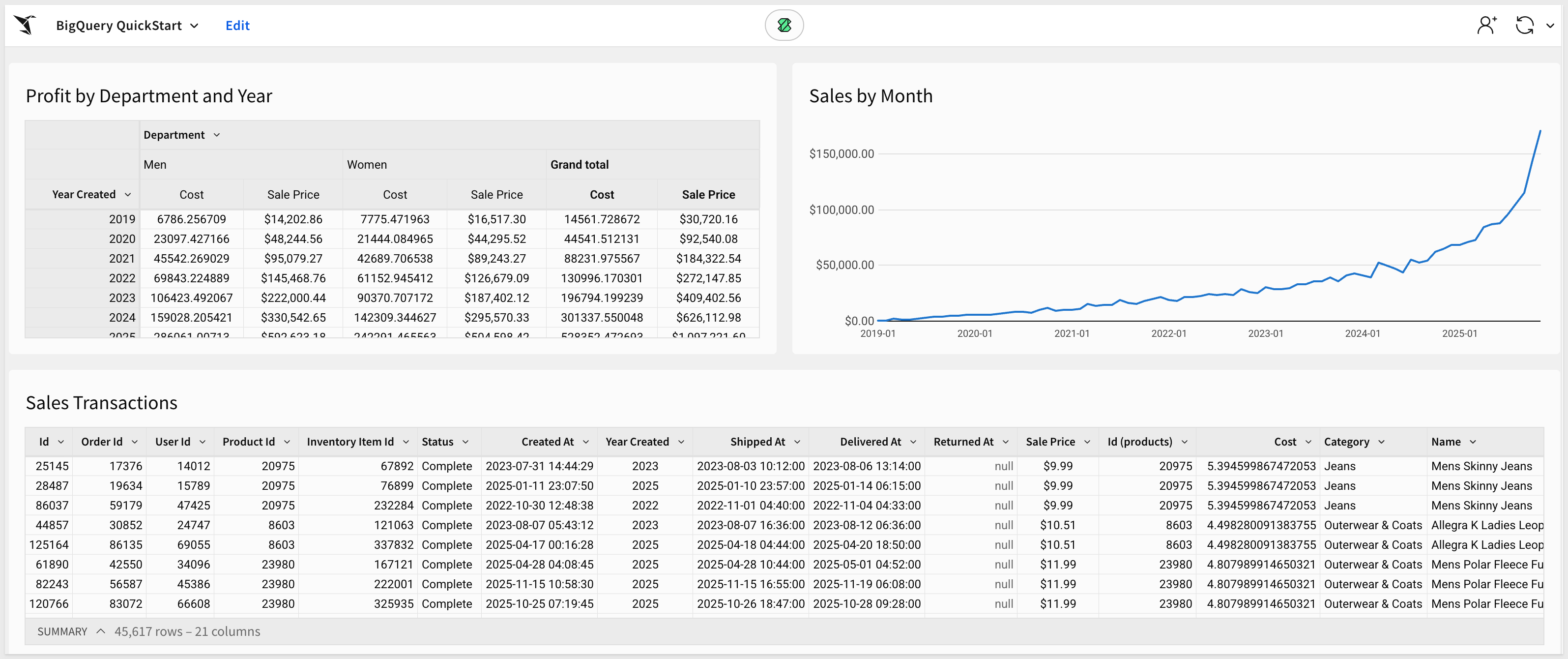 In this QuickStart, you learned how to set up and connect Sigma to BigQuery. Connecting Sigma to BigQuery can provide significant benefits for data analysts and data teams looking to improve their data visualization and analytics capabilities. Using BigQuery as the underlying data warehouse provides a highly scalable and cost-effective solution for storing and querying large volumes of data.