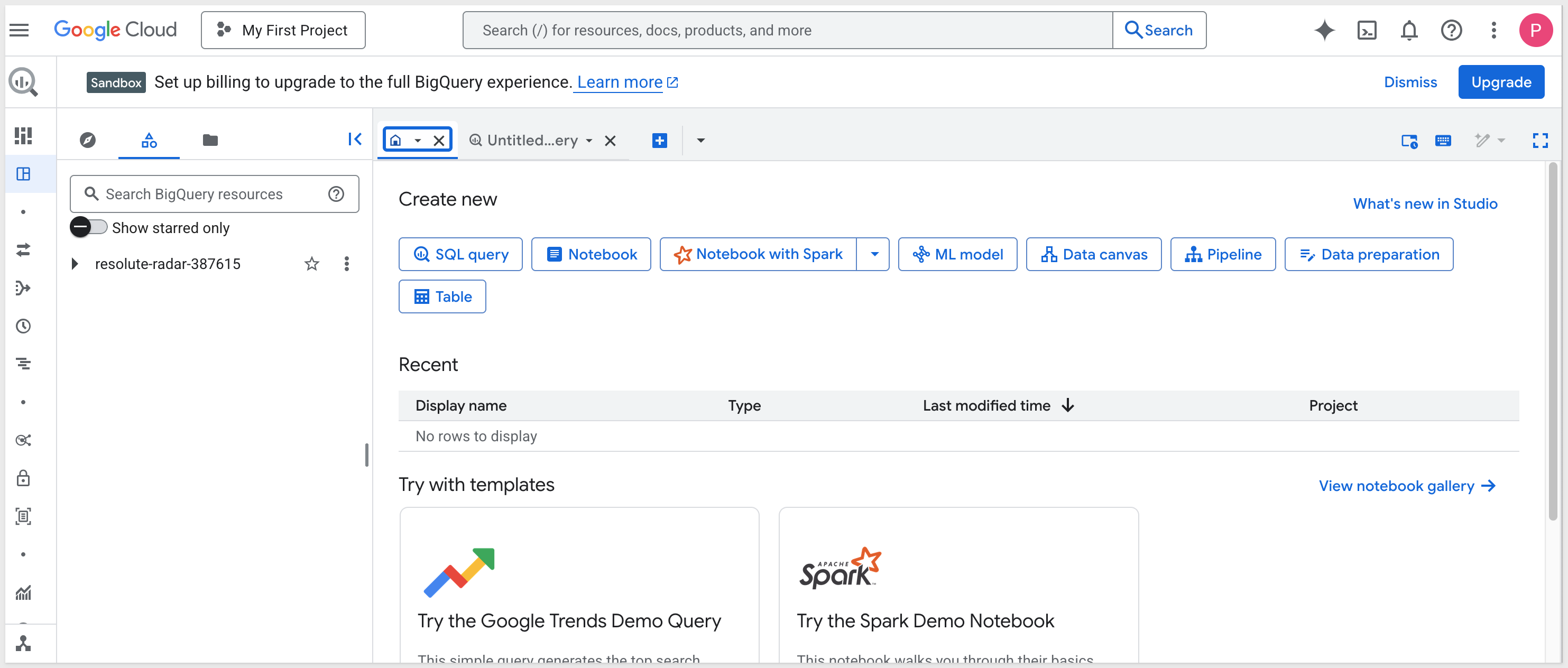 The BigQuery sandbox lets you explore limited BigQuery capabilities at no cost to confirm whether BigQuery fits your needs. The BigQuery sandbox lets you experience BigQuery without providing a credit card or creating a billing account for your project. If you already created a billing account, you can still use BigQuery at no cost in the free usage tier.