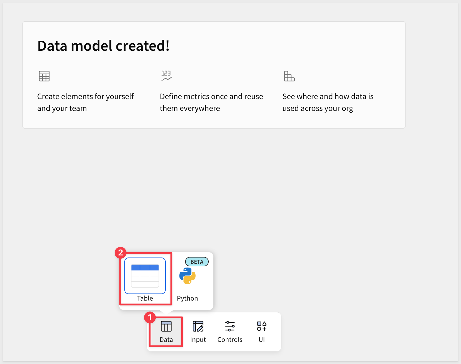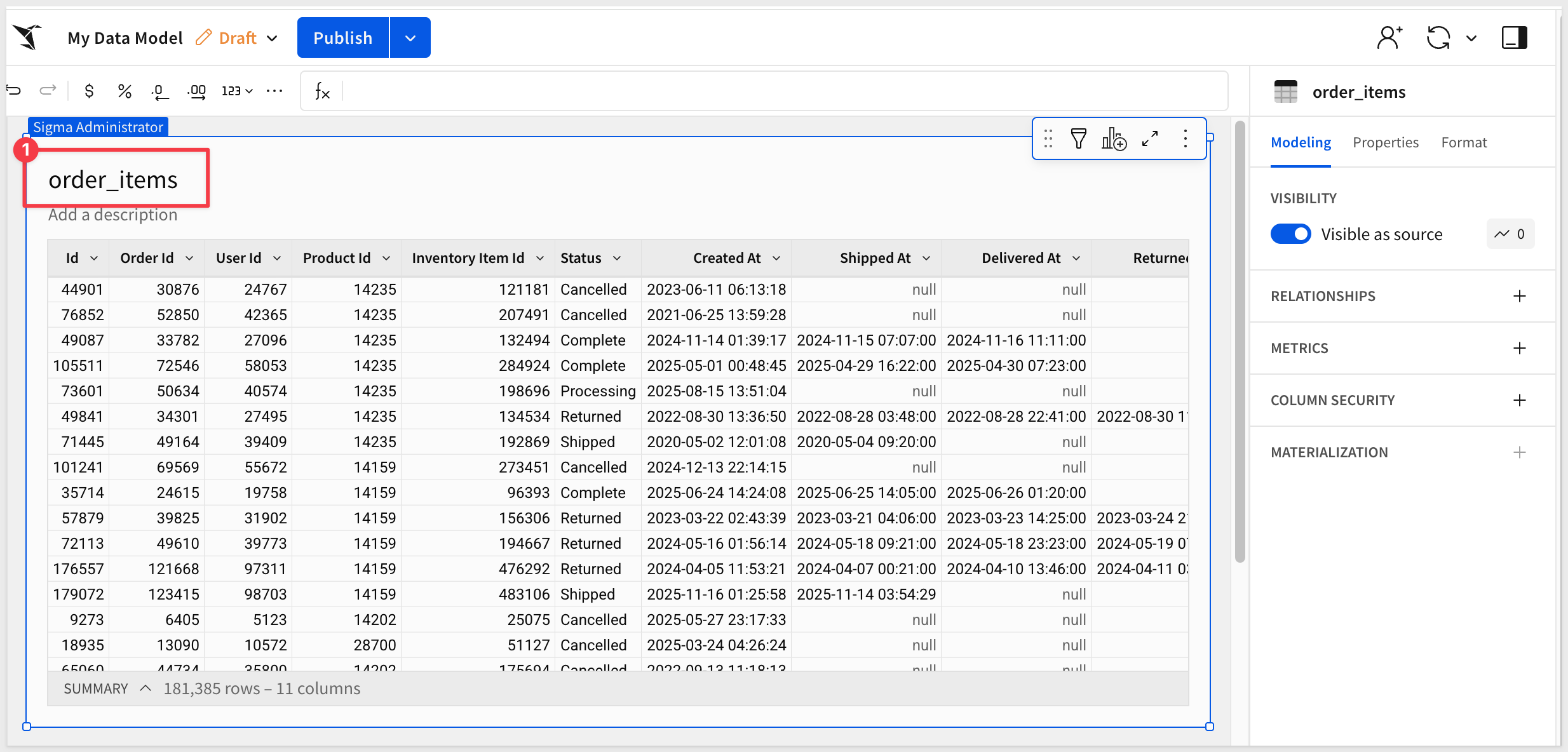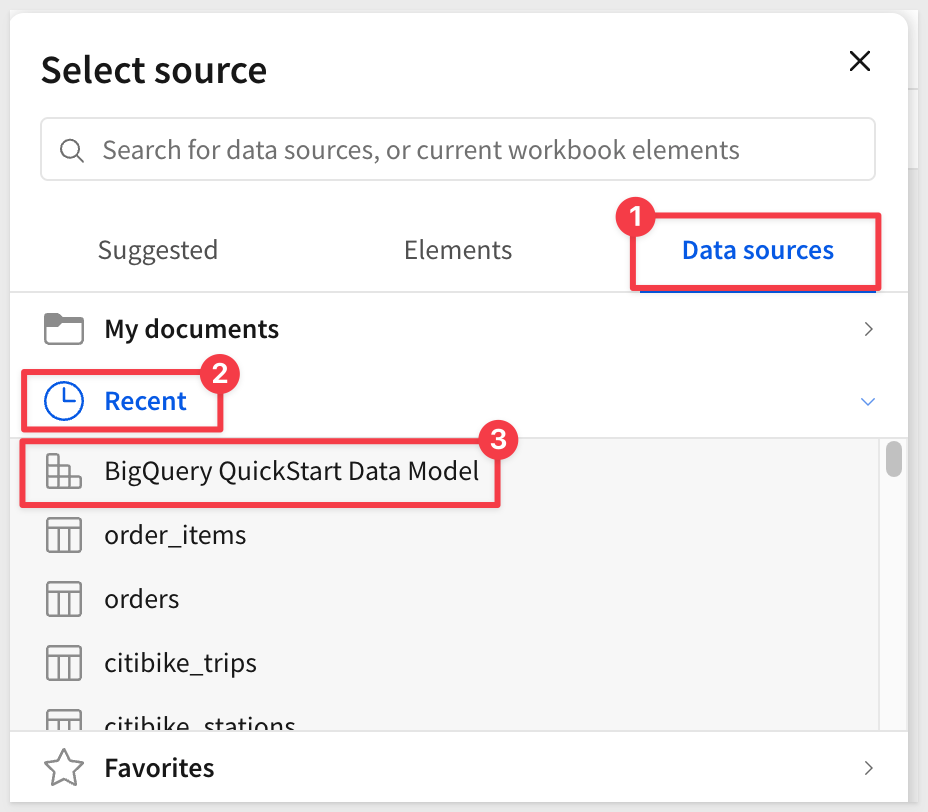 Use the Element Panel and select a new Data > Table. Select Data sources and in Recent the BigQuery QuickStart Data Model is available. Click that and then the order_items table: