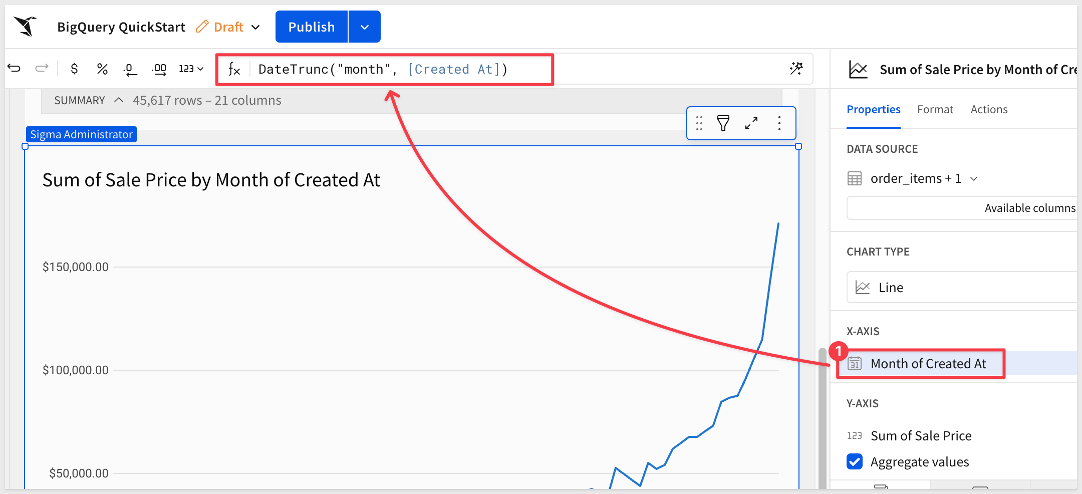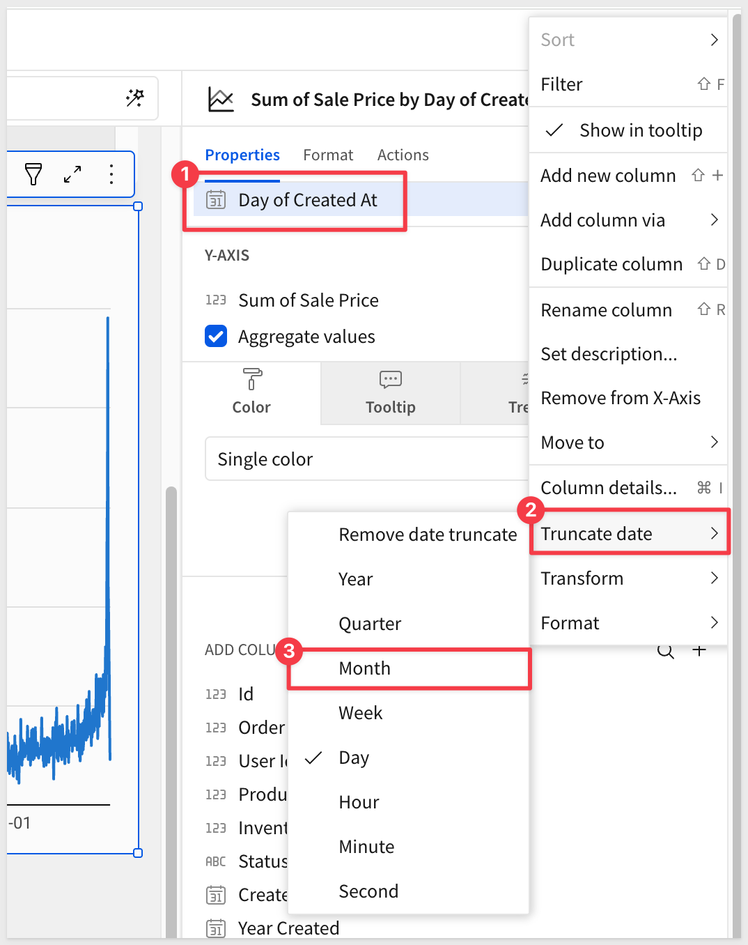 We can use the drop menus (as before) to truncate the Day of Created At column in the X-AXIS to month: