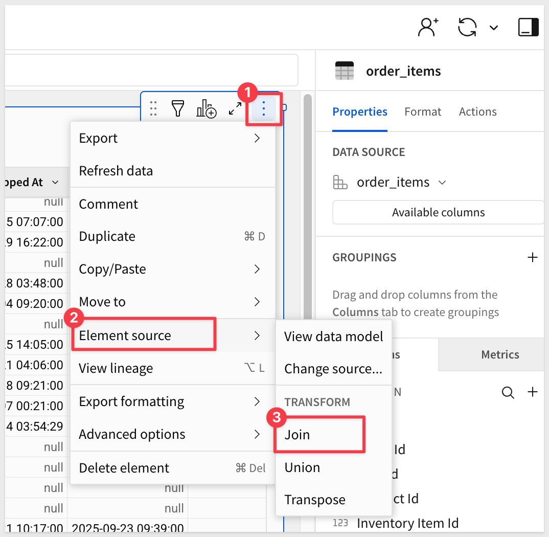 Click the "hamburger menu" (3-dots) and select Element Source > Join: