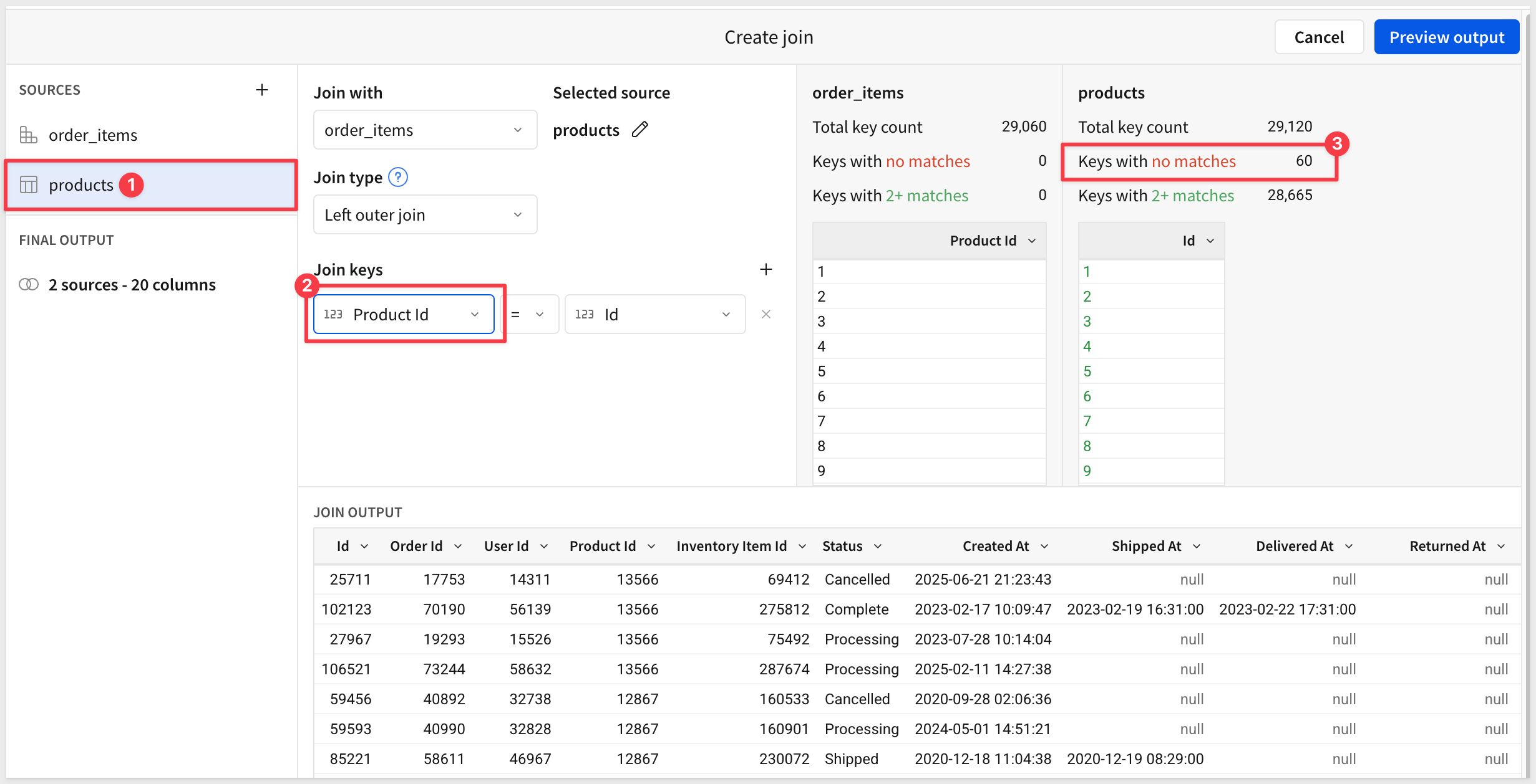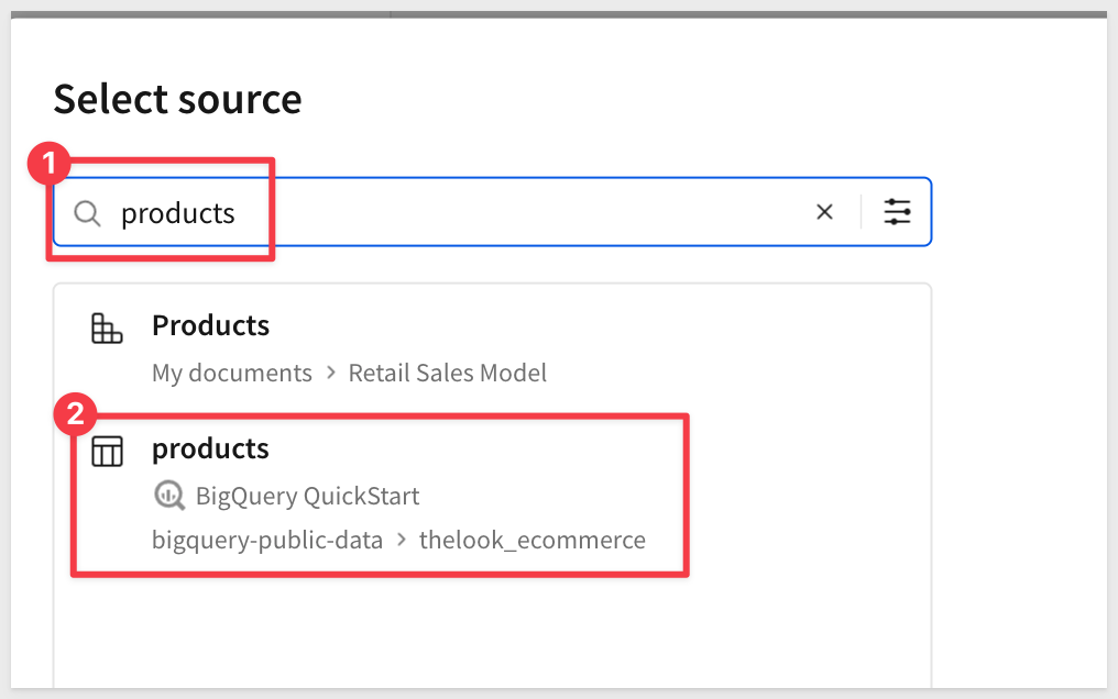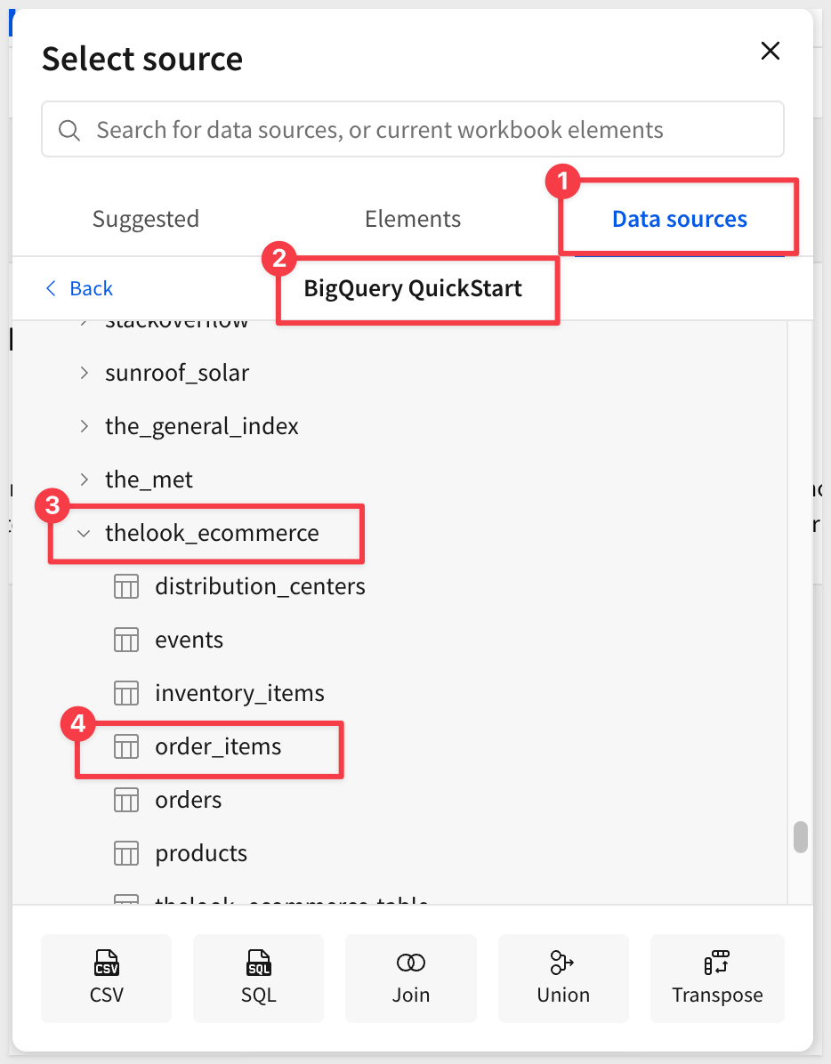 For Source, navigate to Connections > GCP Trial Account to BigQuery > bigquery-public-data > thelook_ecommerce database > order_items table: