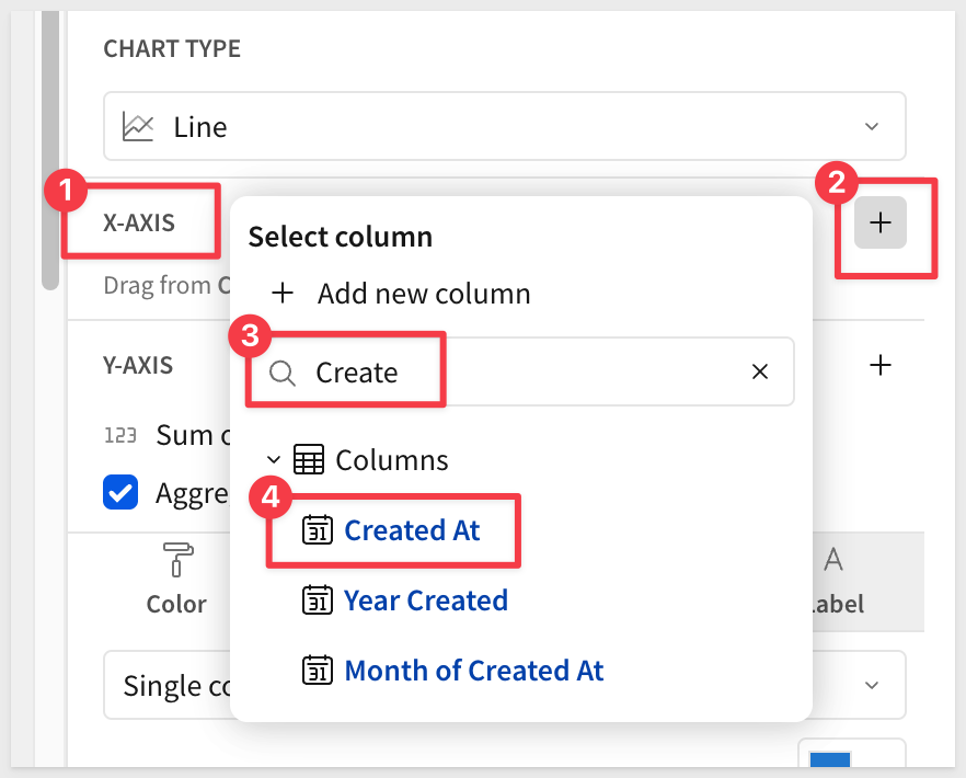With the new chart selected, we'll start by adding the Created At field to the x-axis. You can either use drag and drop interface or search for it, like in the example below: