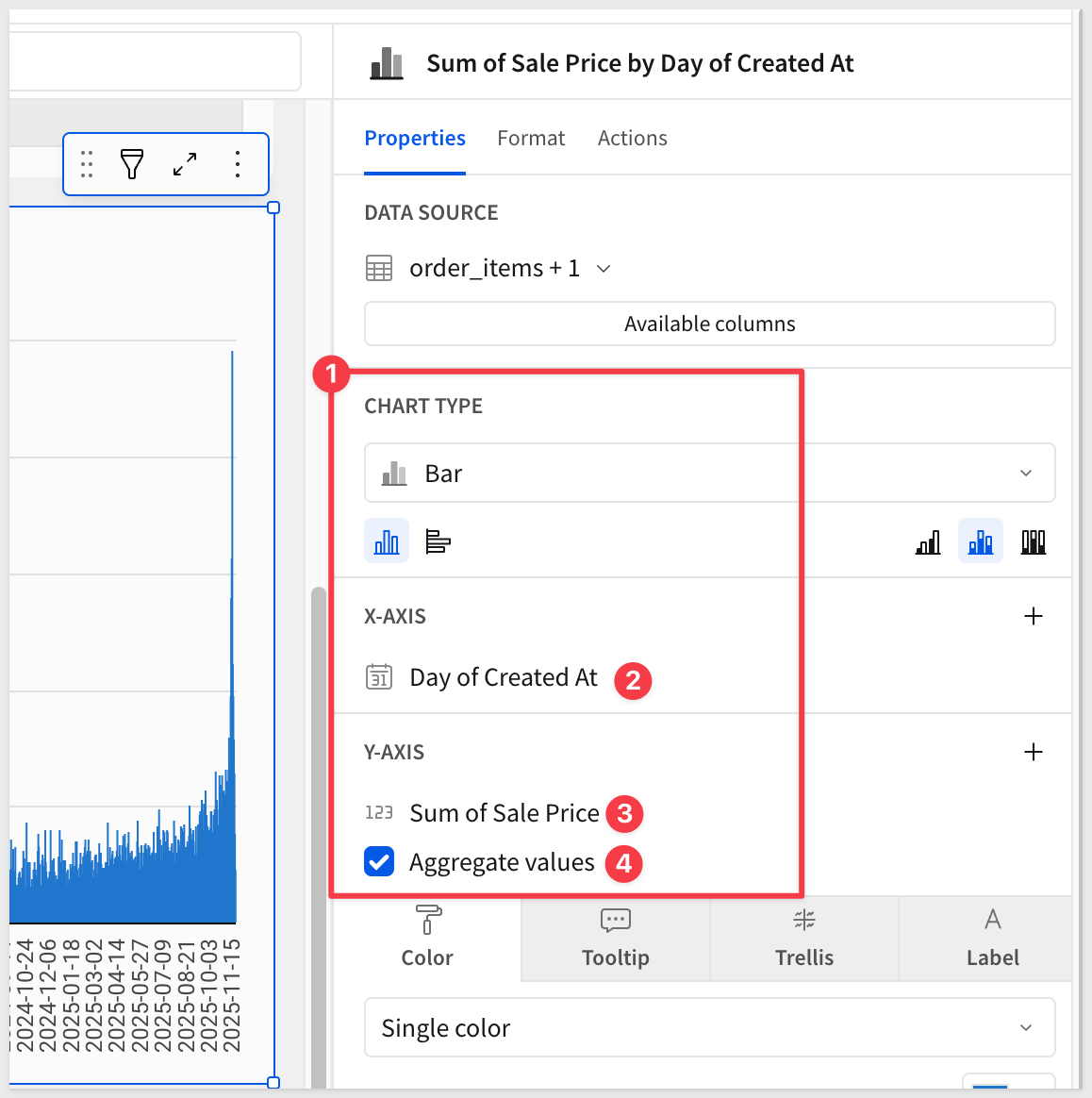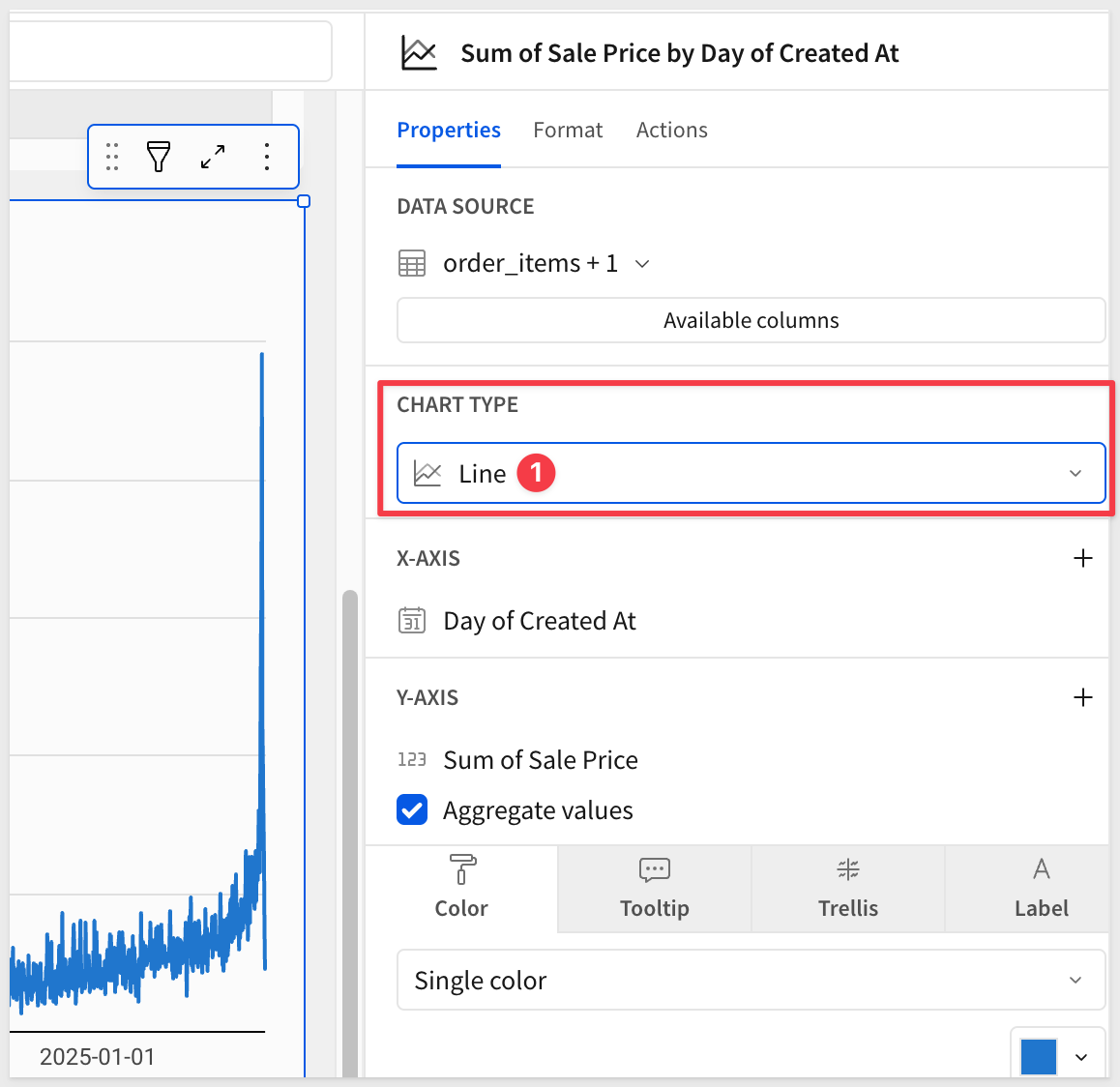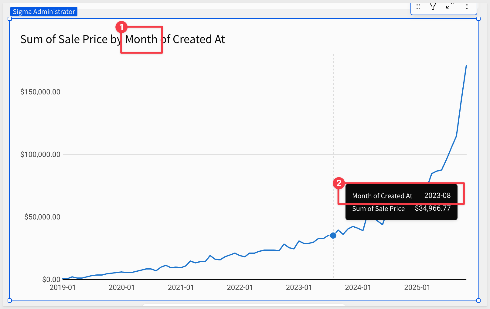 The visualization will appear showing the sum of Sale Price by Created At for the availble data in the table:
