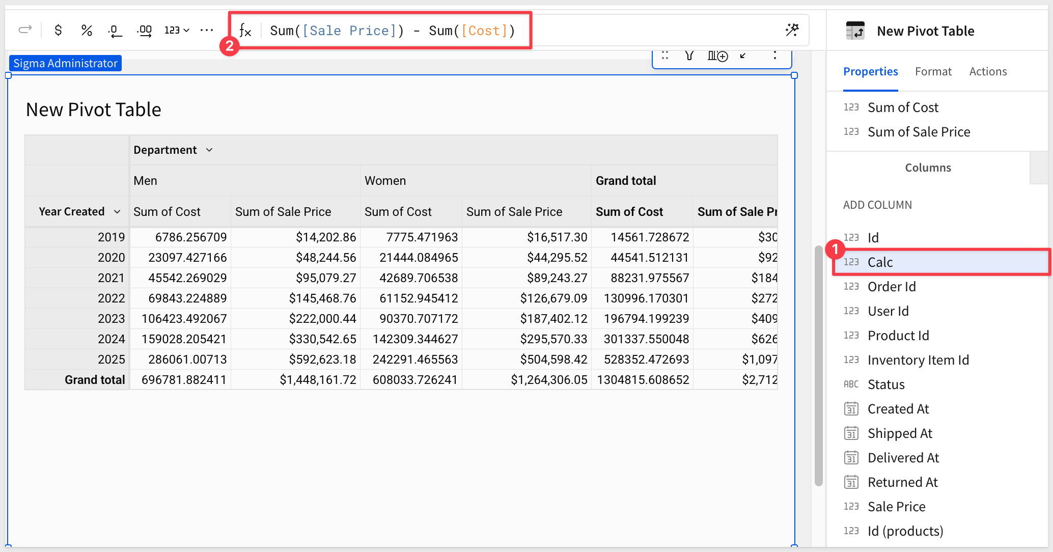 In this example we'll simply add our Cost and Sale Price columns to the values section.